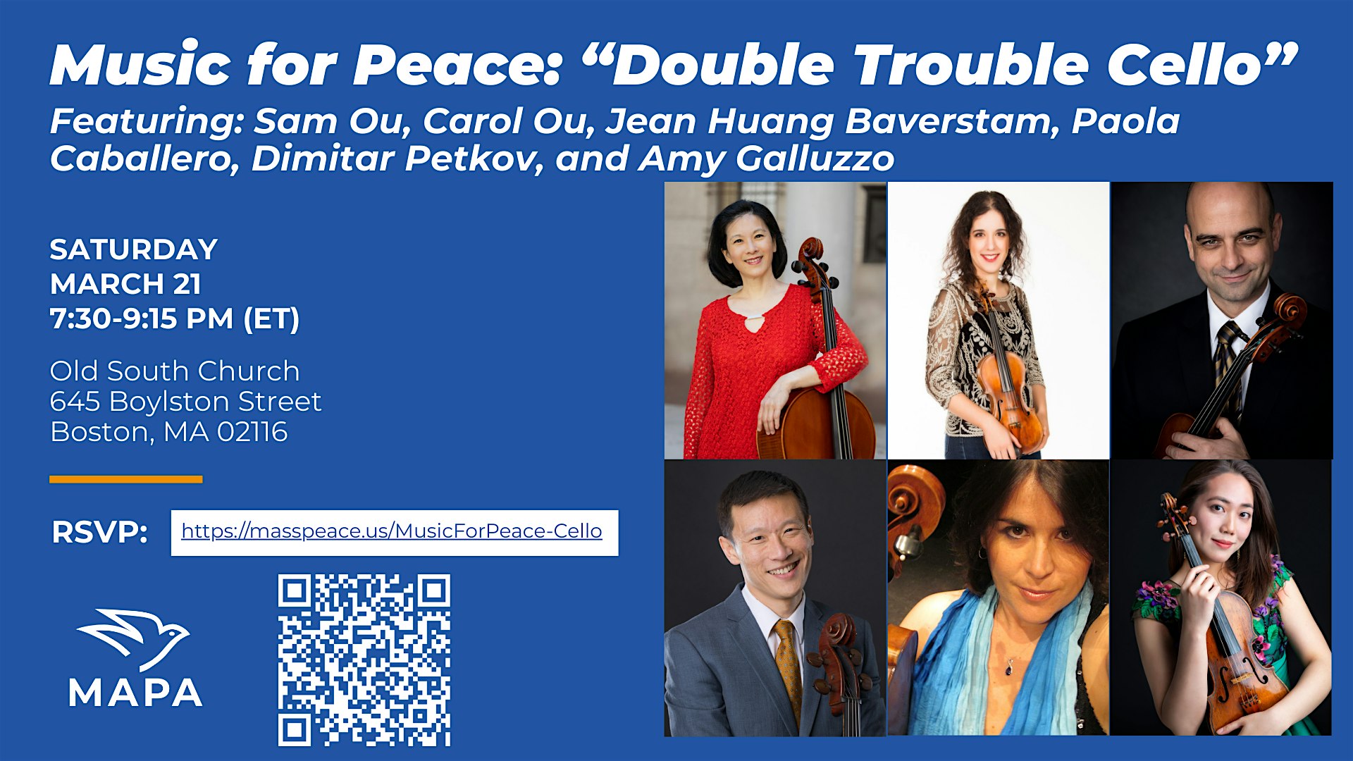 by admin24Feb Music for Peace: “Double Trouble Cello” at Old South Church in Boston – Boston, MA Music for Peace: “Double Trouble Cello” at Old South Church in Boston – Boston, MA 2 2 people viewed this event. Get ready for double the cello vibes at Music for Peace: Double Trouble Cello! Tickets-RSVP Link Date And Time Saturday, March 21st, 2026 07:00 PM (PST) Venue Old South Church in Boston Location 645 Boylston Street, Boston, MA 2116 Event Types Concert or PerformanceMusic Event Category BostonMassachusetts Share With Friends Facebook Twitter Linkedin Xing Pinterest Share This Post:
