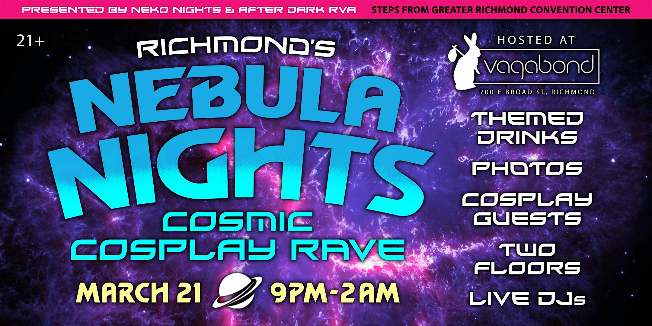 by admin27Feb Nebula Nights: Cosmic Cosplay Rave (Richmond) at Vagabond – Richmond, VA Nebula Nights: Cosmic Cosplay Rave (Richmond) at Vagabond – Richmond, VA 1 1 people viewed this event. Strap in & blast off into the cosmos for the galaxy’s best Con After-Party – just steps away from the Greater RVA Convention Center! (21+) Tickets-RSVP Link Date And Time Saturday, March 21st, 2026 @ 09:00 PM Location 700 East Broad Street, Richmond, VA 23219 Event Types Community & CultureParty or Social Gathering Event Category Virginia Share With Friends Facebook Twitter Linkedin Xing Pinterest Share This Post: