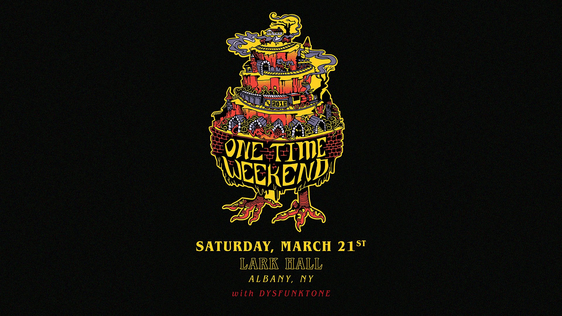 by admin24Feb One Time Weekend w/s/g Dysfunktone at Lark Hall – Albany, NY One Time Weekend w/s/g Dysfunktone at Lark Hall – Albany, NY 2 2 people viewed this event. Join us in welcoming back One Time Weekend wsg Dysfunktone to Lark Hall on Saturday, March 21st. Doors 7/ Show 8. Tickets-RSVP Link Date And Time Saturday, March 21st, 2026 08:00 PM (PST) Venue Lark Hall Location 351 Hudson Avenue, Albany, NY 12210 Event Types Concert or PerformanceMusic Event Category New York Share With Friends Facebook Twitter Linkedin Xing Pinterest Share This Post: