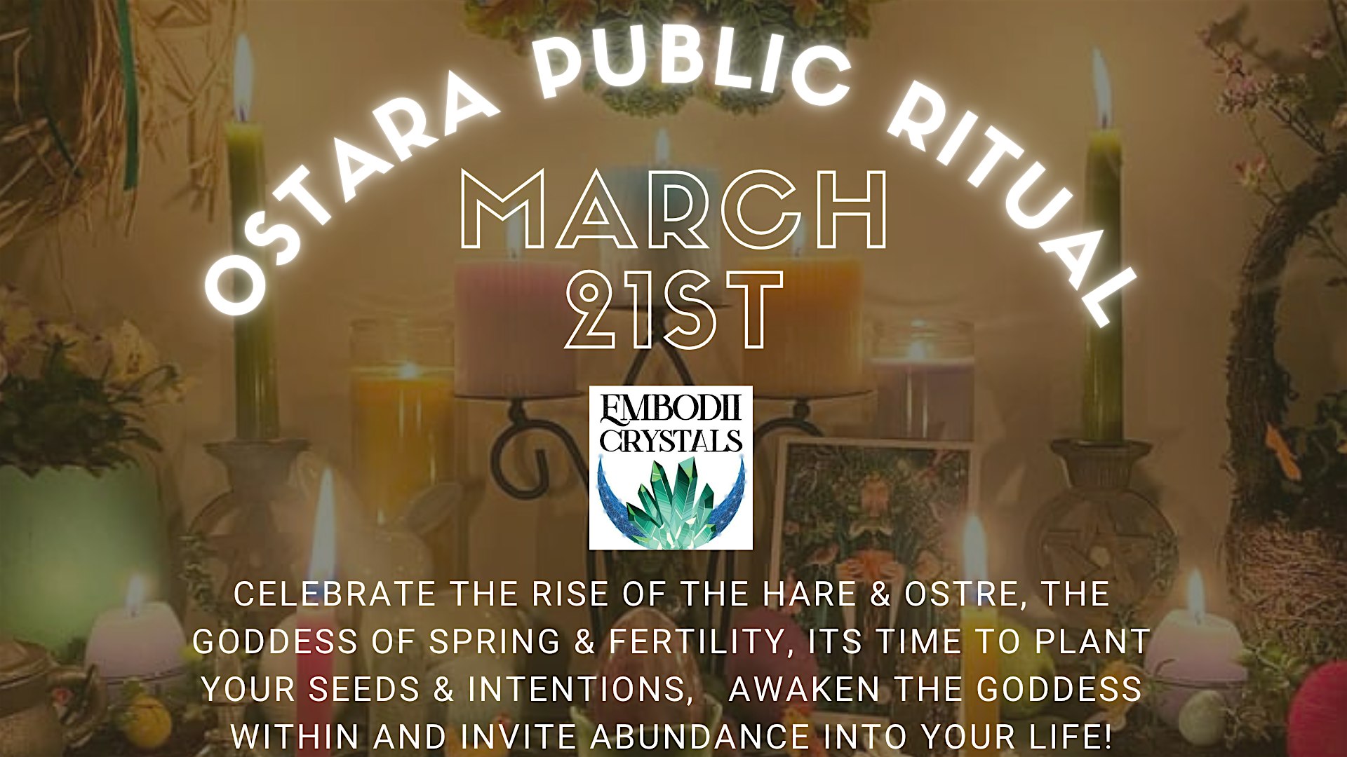 by admin27Feb Ostara Public Ritual at Embodii Crystals – Richland Hills, TX Ostara Public Ritual at Embodii Crystals – Richland Hills, TX 1 1 people viewed this event. Honor the hare, the goddess, and the return of spring! Water your seeds of intentions, our fertile sacral chakra is fruitful! Tickets-RSVP Link Date And Time Saturday, March 21st, 2026 @ 07:00 PM Location 7410 Boulevard 26, Richland Hills, TX 76118 Event Types Party or Social Gathering Event Category Texas Share With Friends Facebook Twitter Linkedin Xing Pinterest Share This Post: