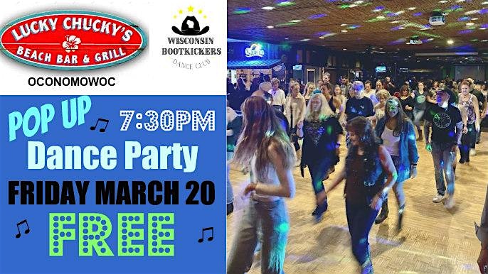 by admin13Feb Pop Up Line Dance Party / Lucky Chuckys / Oconomowoc / FREE at Lucky Chucky’s Beach Bar and Grill – Oconomowoc, WI Pop Up Line Dance Party / Lucky Chuckys / Oconomowoc / FREE at Lucky Chucky’s Beach Bar and Grill – Oconomowoc, WI 2 2 people viewed this event. Come Line Dance with us! Tickets-RSVP Link Date And Time Saturday, March 21st, 2026 12:00 AM (PST) Venue Lucky Chucky's Beach Bar and Grill Location 37238 Valley Road, Oconomowoc, WI 53066 Event Types MusicParty or Social Gathering Event Category Wisconsin Share With Friends Facebook Twitter Linkedin Xing Pinterest Share This Post: