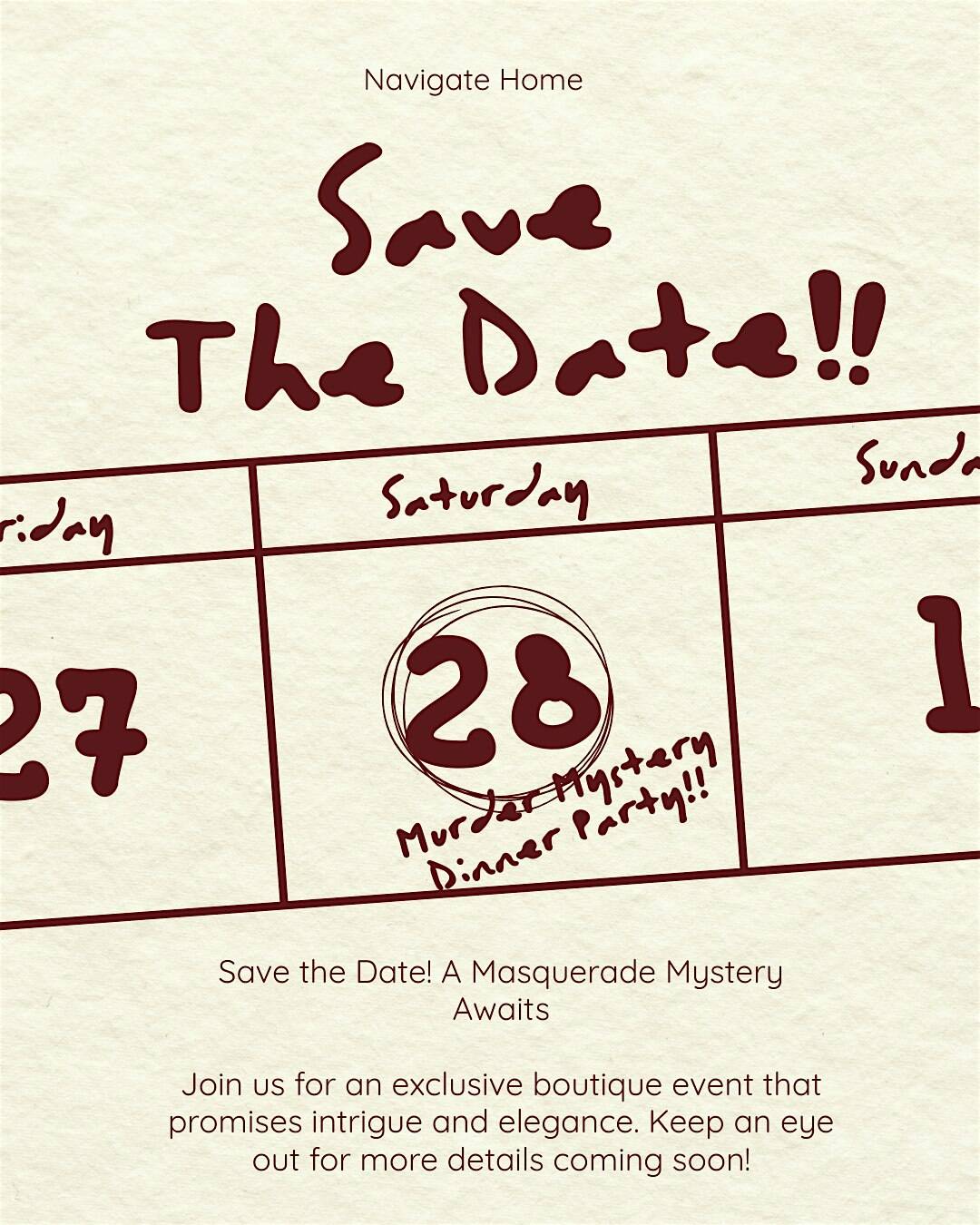 by admin23Feb PROJECT: MASQUERADE DINNER | An Immersive Murder Mystery Thriller at 3105 NE 11th St – Bentonville, AR PROJECT: MASQUERADE DINNER | An Immersive Murder Mystery Thriller at 3105 NE 11th St – Bentonville, AR 1 1 people viewed this event. Get ready to step into a world of mystery and intrigue at PROJECT: MASQUERADE DINNER – An Immersive Murder Mystery Thriller! Tickets-RSVP Link Date And Time Saturday, March 21st, 2026 05:00 PM (PST) Venue 3105 NE 11th St Location 3105 Northeast 11th Street, Bentonville, AR 72712 Event Types Food & DrinkParty or Social Gathering Event Category Arkansas Share With Friends Facebook Twitter Linkedin Xing Pinterest Share This Post: