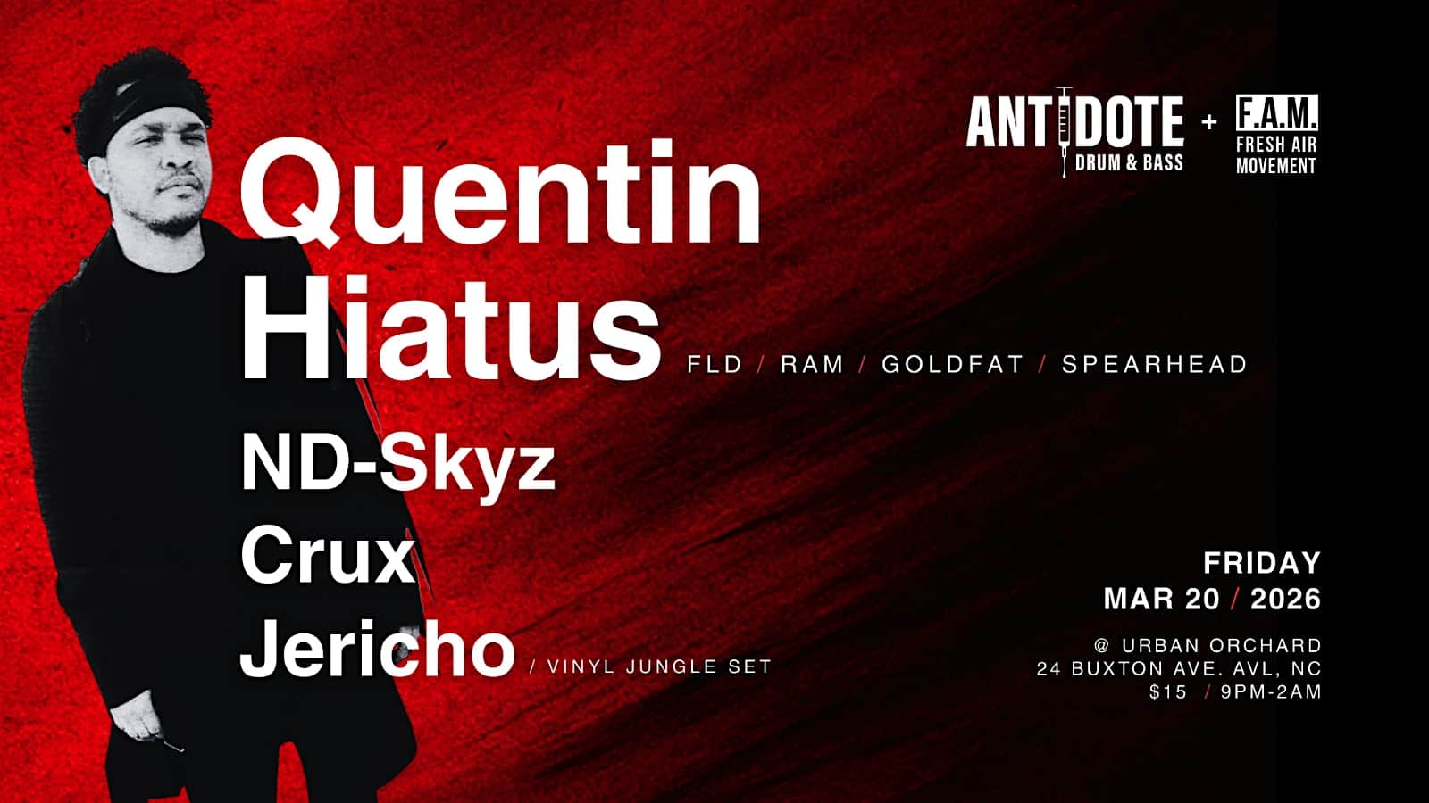 by admin23Feb Quentin Hiatus, ND-Skyz, Crux, Jericho at Urban Orchard Cider Co. – Asheville, NC Quentin Hiatus, ND-Skyz, Crux, Jericho at Urban Orchard Cider Co. – Asheville, NC 2 2 people viewed this event. We proudly present drum and bass legend Quentin Hiatus alongside ND-Skyz, Crux, And Jericho with a Viynl Jungle Set Tickets-RSVP Link Date And Time Saturday, March 21st, 2026 09:00 PM (PST) Venue Urban Orchard Cider Co. Location 24 Buxton Avenue, Asheville, NC 28801 Event Types Concert or PerformanceMusic Event Category North Carolina Share With Friends Facebook Twitter Linkedin Xing Pinterest Share This Post: