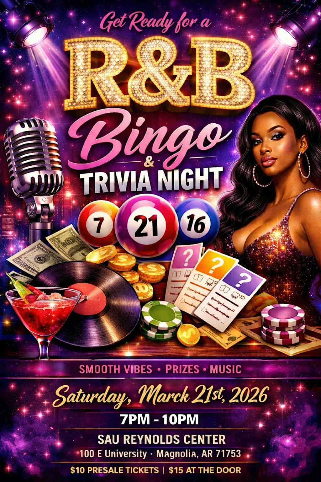 by admin23Feb RnB Bingo & Trivia at Magnolia – Magnolia, AR RnB Bingo & Trivia at Magnolia – Magnolia, AR 3 3 people viewed this event. Get ready to test your RnB knowledge and bingo skills at the upcoming event, it’s going to be a night to remember! Tickets-RSVP Link Date And Time Saturday, March 21st, 2026 07:00 PM (PST) Venue Magnolia Location 100 E University, Magnolia, AR 71753 Event Types Music Event Category Arkansas Share With Friends Facebook Twitter Linkedin Xing Pinterest Share This Post: