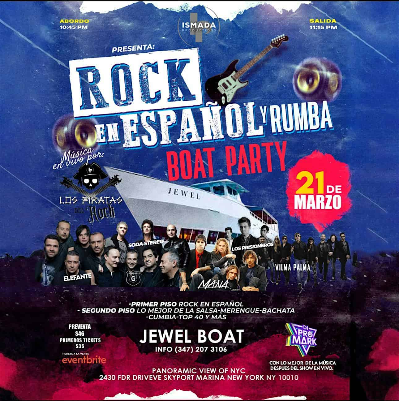 by admin23Feb Rock en Español & Rumba Boat Party en NYC at Skyport Marina – New York, NY Rock en Español & Rumba Boat Party en NYC at Skyport Marina – New York, NY 2 2 people viewed this event. ❤️ San Valentín Boat Party – Rock en Español Romántico en Vivo y rumba mas vista de NYC Tickets-RSVP Link Date And Time Saturday, March 21st, 2026 10:00 PM (PST) Venue Skyport Marina Location 2430 FDR Drive, New York, NY 10010 Event Types MusicParty or Social Gathering Event Category New YorkNew York City Share With Friends Facebook Twitter Linkedin Xing Pinterest Share This Post: