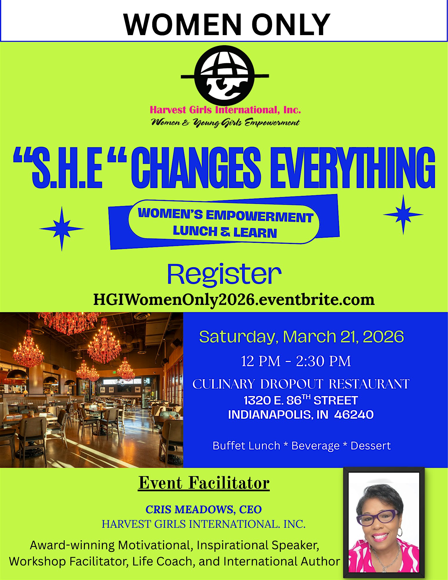by admin24Feb “S.H.E.” Changes Everything! at Culinary Dropout – Indianapolis, IN “S.H.E.” Changes Everything! at Culinary Dropout – Indianapolis, IN 2 2 people viewed this event. Women’s Empowerment Lunch Celebrating National Women’s Month Tickets-RSVP Link Date And Time Saturday, March 21st, 2026 12:00 PM (PST) Venue Culinary Dropout Location 1320 East 86th Street, Indianapolis, IN 46240 Event Types Food & Drink Event Category IndianaIndianapolis Share With Friends Facebook Twitter Linkedin Xing Pinterest Share This Post: