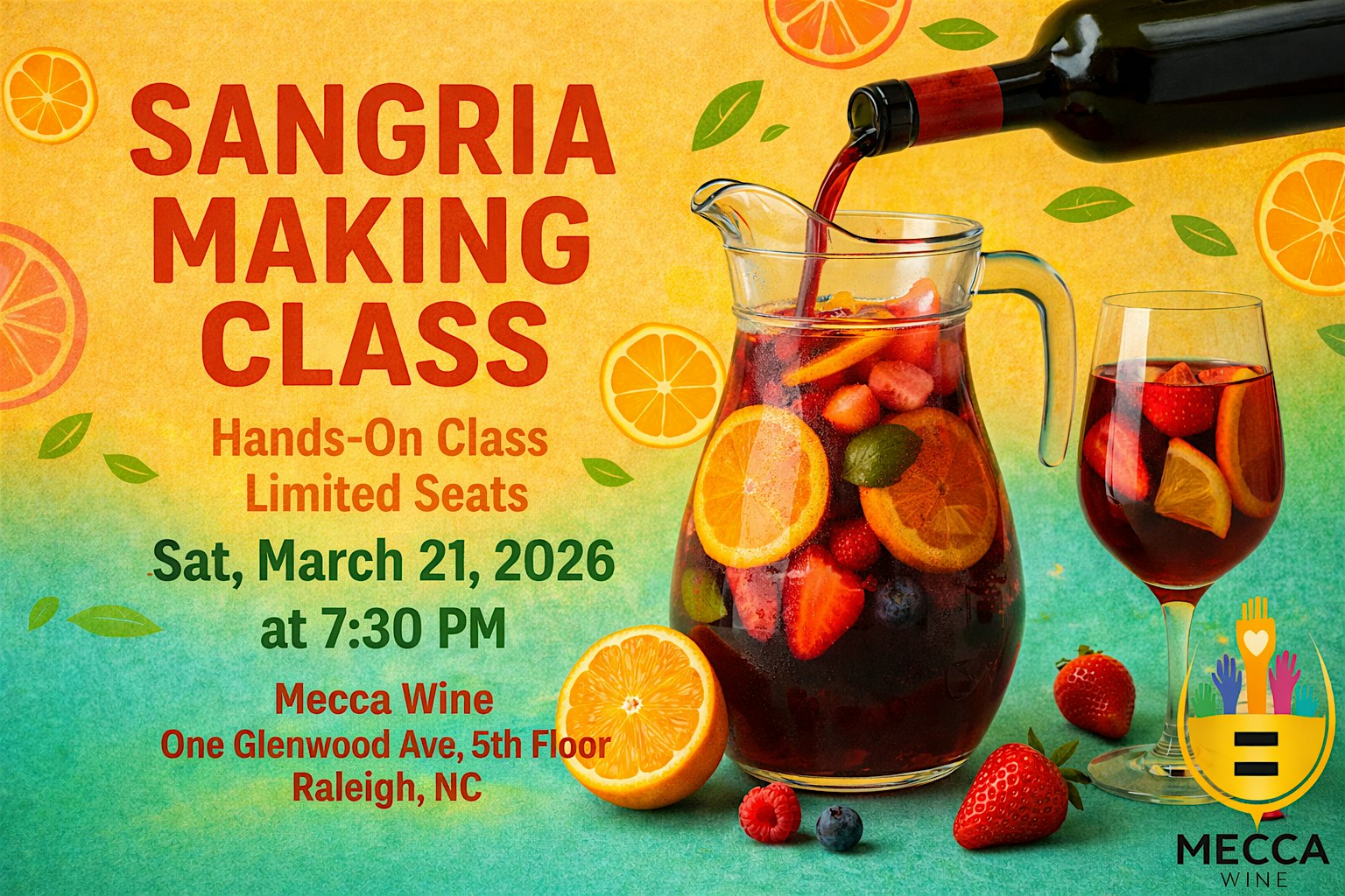 by admin13Feb Sangria Making Class & Wine Tasting! Raleigh, NC – Durham, NC Event at Mecca Wine Distributors – One Glenwood Ave, Raleigh, NC – Raleigh, NC Sangria Making Class & Wine Tasting! Raleigh, NC – Durham, NC Event at Mecca Wine Distributors – One Glenwood Ave, Raleigh, NC – Raleigh, NC 2 2 people viewed this event. Learn to craft delicious Sangria while sipping wine Tickets-RSVP Link Date And Time Saturday, March 21st, 2026 11:00 PM (PST) Venue Mecca Wine Distributors - One Glenwood Ave, Raleigh, NC Location One Glenwood Ave, Raleigh, NC 27603 Event Types Food & DrinkParty or Social Gathering Event Category North CarolinaRaleigh Share With Friends Facebook Twitter Linkedin Xing Pinterest Share This Post: