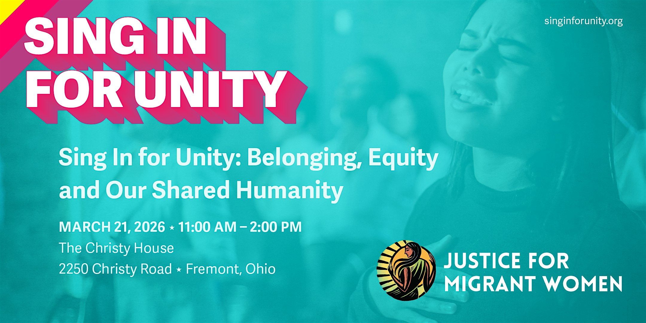 by admin05Mar Sing In for Unity at The Christy House – Event Venue – Fremont, OH Sing In for Unity at The Christy House – Event Venue – Fremont, OH 2 2 people viewed this event. This “Sing In for Unity” lifts our voices together—celebrating culture, building bridges, and declaring with one heart that everyone belongs Tickets-RSVP Link Date And Time Saturday, March 21st, 2026 11:00 AM (PST) Venue The Christy House - Event Venue Location 2255 Christy Road, Fremont, OH 43420 Event Types Community & CultureConcert or Performance Event Category Ohio Share With Friends Facebook Twitter Linkedin Xing Pinterest Share This Post:
