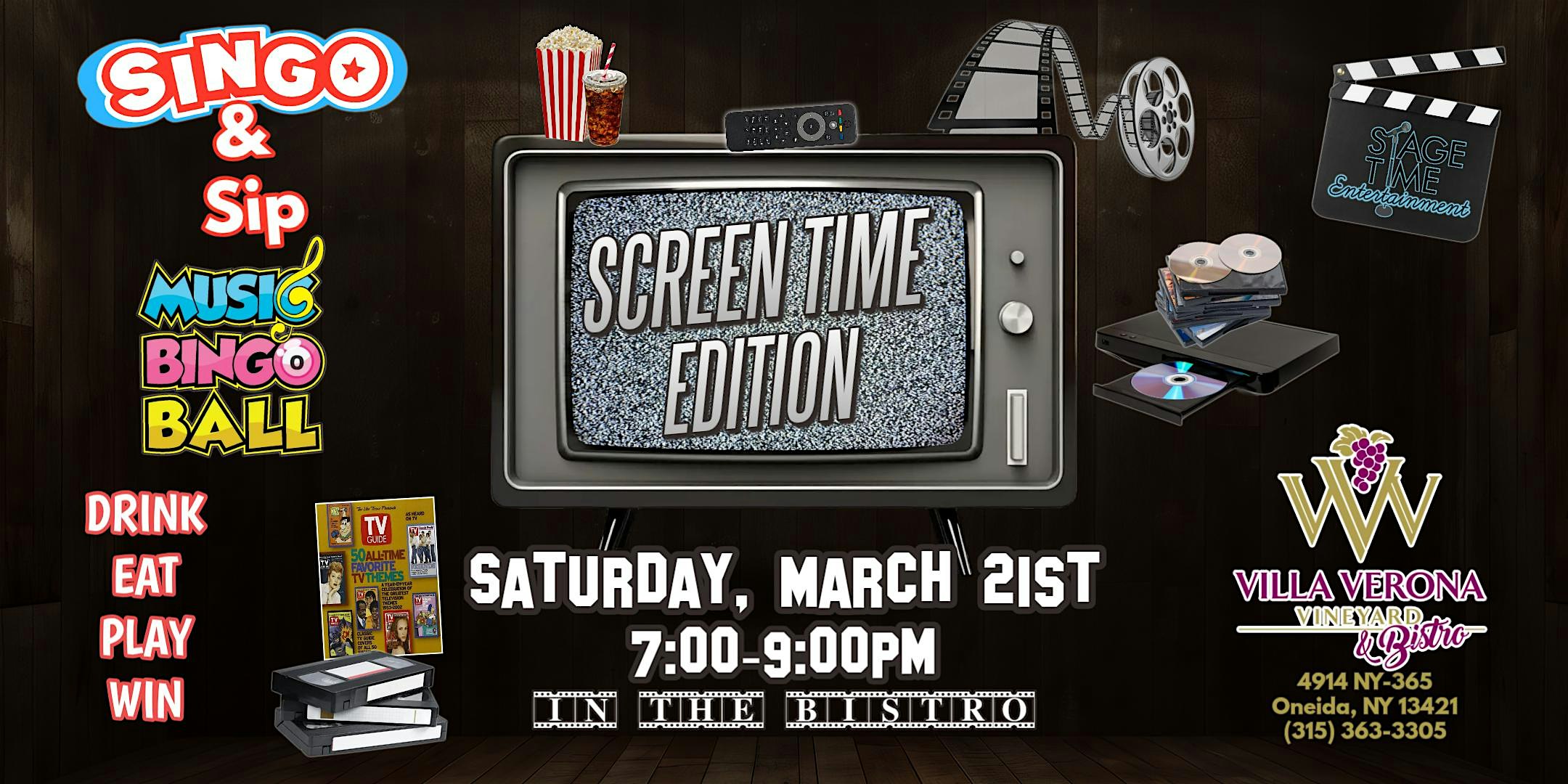 by admin13Feb Singo & Sip at Villa Verona: Screen Time Edition at Villa Verona Vineyard – Oneida, NY Singo & Sip at Villa Verona: Screen Time Edition at Villa Verona Vineyard – Oneida, NY 2 2 people viewed this event. It’s Stage Time’s Music Bingo Ball powered by Singo coming to Villa Verona in Oneida! Music meets bingo while you drink wine and win prizes! Tickets-RSVP Link Date And Time Saturday, March 21st, 2026 11:00 PM (PST) Venue Villa Verona Vineyard Location 4914 New York 365, Oneida, NY 13421 Event Types Food & DrinkParty or Social Gathering Event Category New York Share With Friends Facebook Twitter Linkedin Xing Pinterest Share This Post: