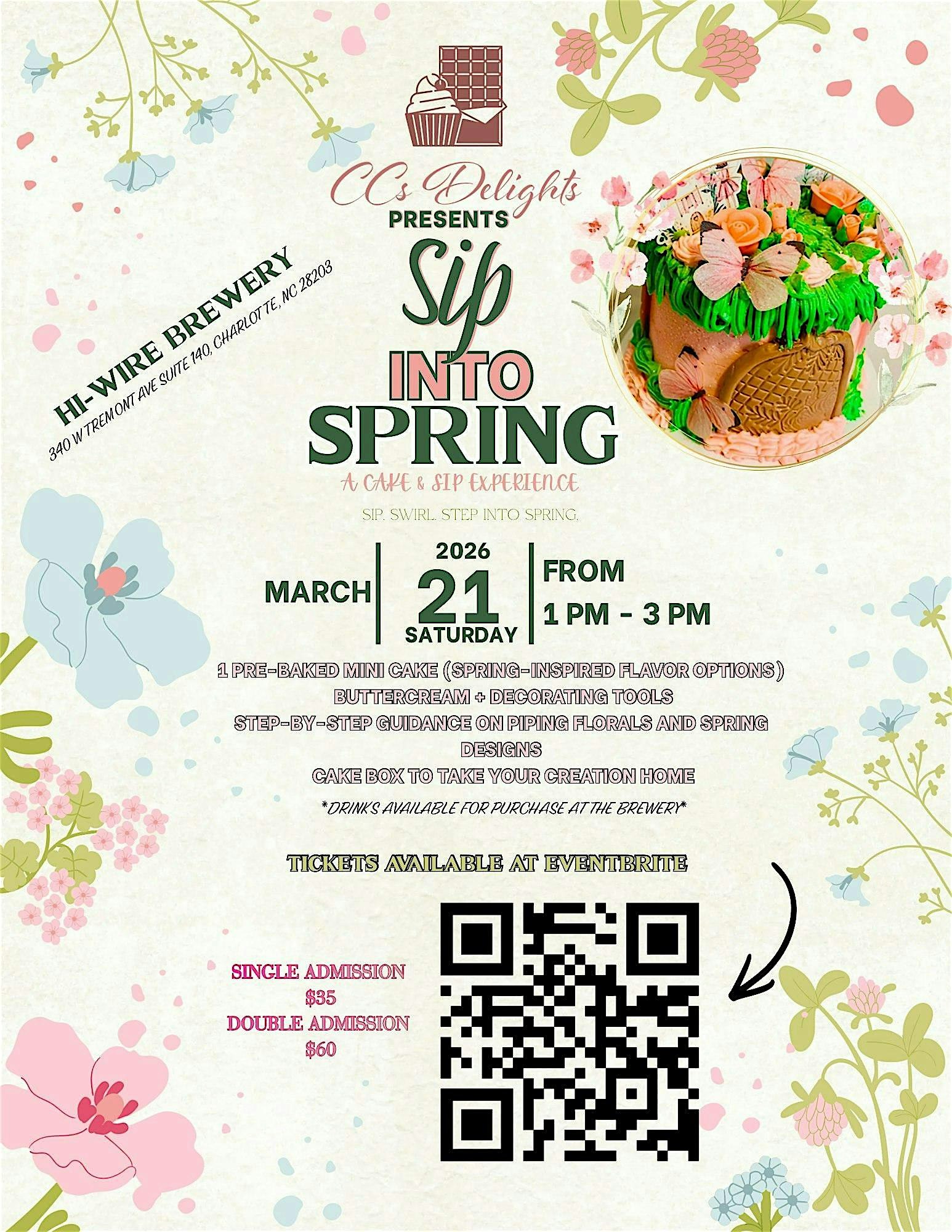 by admin24Feb Sip into Spring at Hi-Wire Brewing and Noble Cider Taproom – Charlotte, NC Sip into Spring at Hi-Wire Brewing and Noble Cider Taproom – Charlotte, NC 3 3 people viewed this event. Sip, swirl, and welcome spring with a mini cake decorating experience filled with florals, fresh vibes, and sweet fun. Tickets-RSVP Link Date And Time Saturday, March 21st, 2026 01:00 PM (PST) Venue Hi-Wire Brewing and Noble Cider Taproom Location 340 West Tremont Avenue, Charlotte, NC 28203 Event Types Food & DrinkParty or Social Gathering Event Category CharlotteNorth Carolina Share With Friends Facebook Twitter Linkedin Xing Pinterest Share This Post: