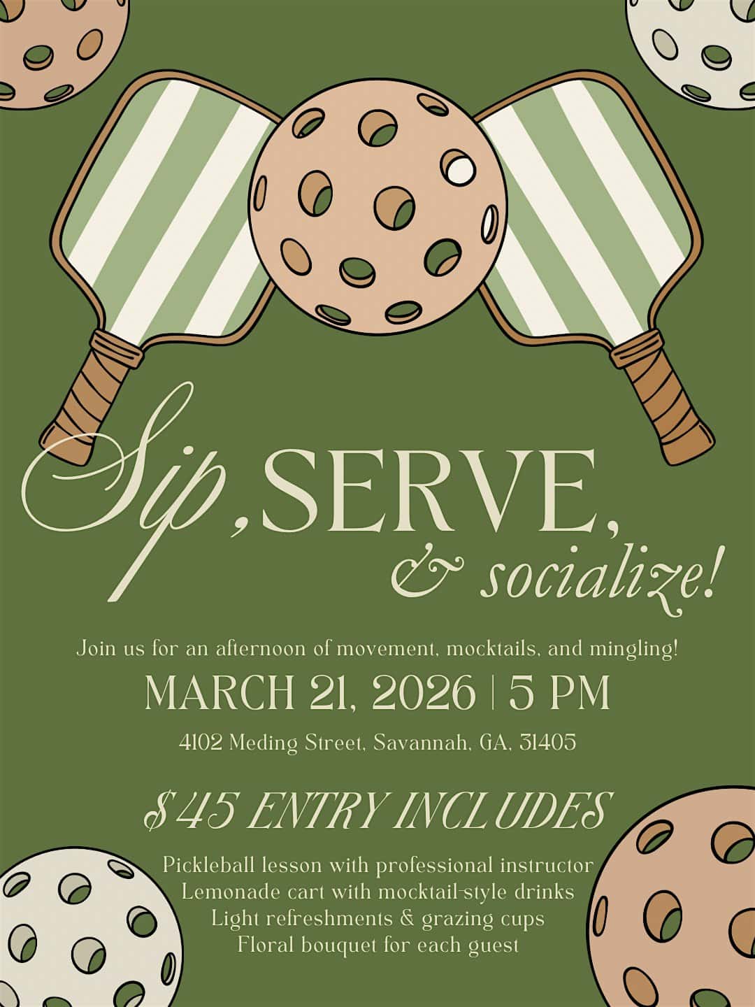 by admin23Feb Sip, Serve, & Socialize at 4102 Meding St – Savannah, GA Sip, Serve, & Socialize at 4102 Meding St – Savannah, GA 1 1 people viewed this event. A pickleball social with mocktails, curated bites and friendly matches! Tickets-RSVP Link Date And Time Saturday, March 21st, 2026 05:00 PM (PST) Venue 4102 Meding St Location 4102 Meding Street, Savannah, GA 31405 Event Types Food & DrinkParty or Social Gathering Event Category Georgia Share With Friends Facebook Twitter Linkedin Xing Pinterest Share This Post: