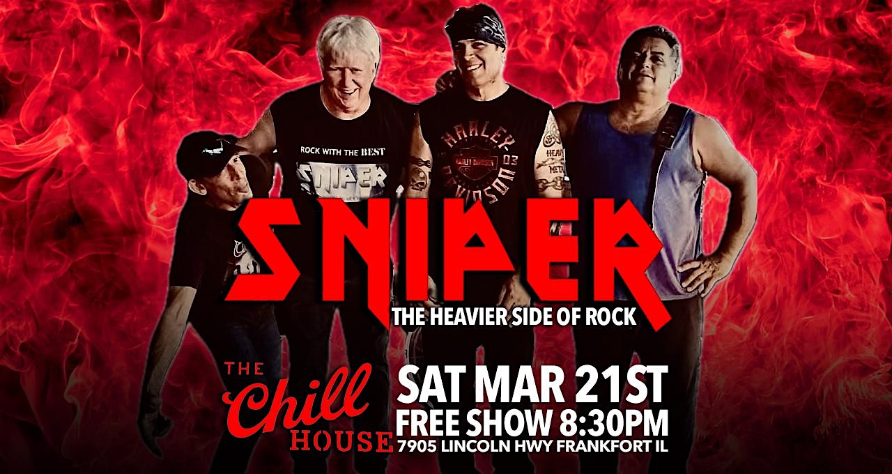 by admin24Feb Sniper The Heavier Side of Rock at The Chill House at 7905 W Lincoln Hwy – Frankfort, IL Sniper The Heavier Side of Rock at The Chill House at 7905 W Lincoln Hwy – Frankfort, IL 2 2 people viewed this event. Get ready to rock hard with Sniper’s heavy vibes live at The Chill House—no fluff, just pure energy! Tickets-RSVP Link Date And Time Saturday, March 21st, 2026 08:00 PM (PST) Venue 7905 W Lincoln Hwy Location 7905 West Lincoln Highway, Frankfort, IL 60423 Event Types Concert or PerformanceMusic Event Category Illinois Share With Friends Facebook Twitter Linkedin Xing Pinterest Share This Post: