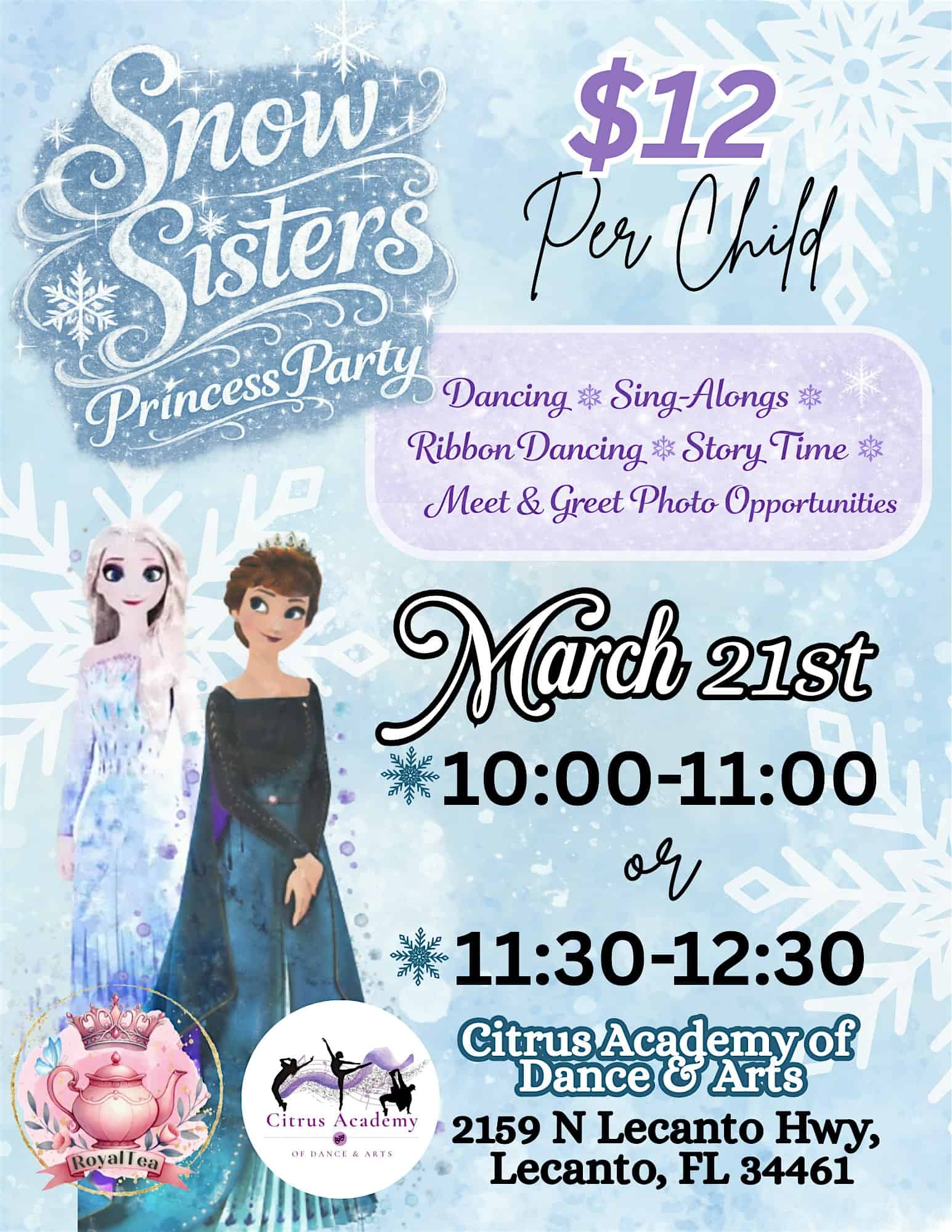 by admin14Feb Snow Sisters Princess Party at 2159 N Lecanto Hwy – Lecanto, FL Snow Sisters Princess Party at 2159 N Lecanto Hwy – Lecanto, FL 2 2 people viewed this event. Meet our RoyalTea Snow Sisters for a magical hour of dancing, sing-alongs, ribbon dancing, story time, and photo opportunities! Tickets-RSVP Link Date And Time Saturday, March 21st, 2026 02:00 PM (PST) Venue 2159 N Lecanto Hwy Location 2159 North Lecanto Highway, Lecanto, FL 34461 Event Types Party or Social Gathering Event Category Florida Share With Friends Facebook Twitter Linkedin Xing Pinterest Share This Post: