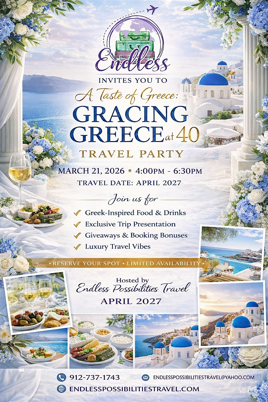 by admin27Feb Taste of Greece at 103 Turnberry St – Port Wentworth, GA Taste of Greece at 103 Turnberry St – Port Wentworth, GA 1 1 people viewed this event. The official travel party for Gracing Greece at 40. Enjoy Greek-inspired bites, a luxury trip preview, and exclusive booking bonuses Tickets-RSVP Link Date And Time Saturday, March 21st, 2026 @ 04:00 PM Location 103 Turnberry Street, Port Wentworth, GA 31407 Event Types Food & DrinkOther Event Category Georgia Share With Friends Facebook Twitter Linkedin Xing Pinterest Share This Post: