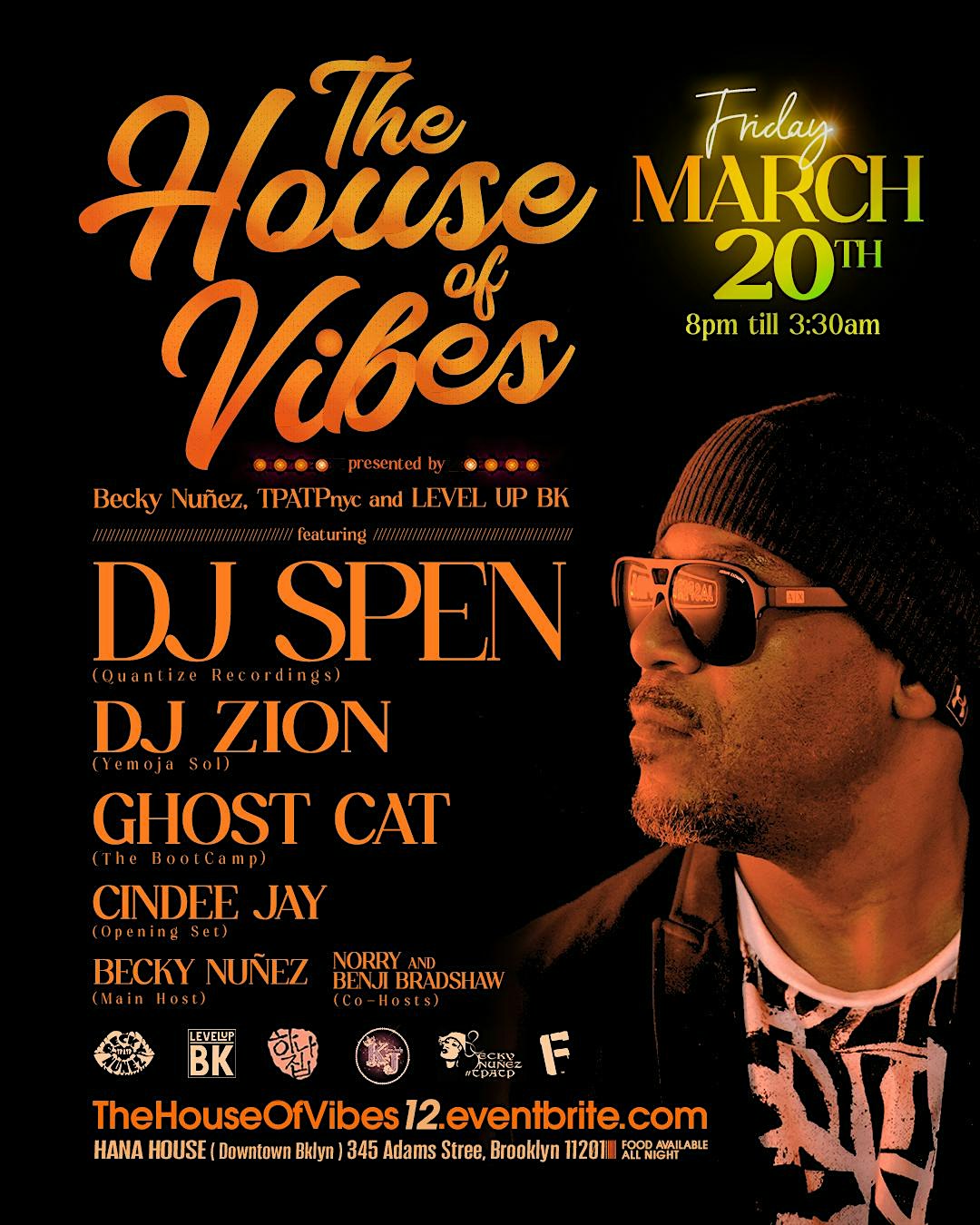 by admin13Feb “THE HOUSE OF VIBES” w/ GRAMMY AWARD WINNING PRODUCER **DJ SPEN** at Hana House – Brooklyn, NY “THE HOUSE OF VIBES” w/ GRAMMY AWARD WINNING PRODUCER **DJ SPEN** at Hana House – Brooklyn, NY 1 1 people viewed this event. “THE HOUSE OF VIBES” w/ GRAMMY AWARD WINNING PRODUCER **DJ SPEN** ALONG SIDE DJ ZION, DJ GHOST CAT, CINDEE JAY Tickets-RSVP Link Date And Time Saturday, March 21st, 2026 12:00 AM (PST) Venue Hana House Location 345 Adams Street, Brooklyn, NY 11201 Event Types Concert or PerformanceMusic Event Category New York Share With Friends Facebook Twitter Linkedin Xing Pinterest Share This Post: