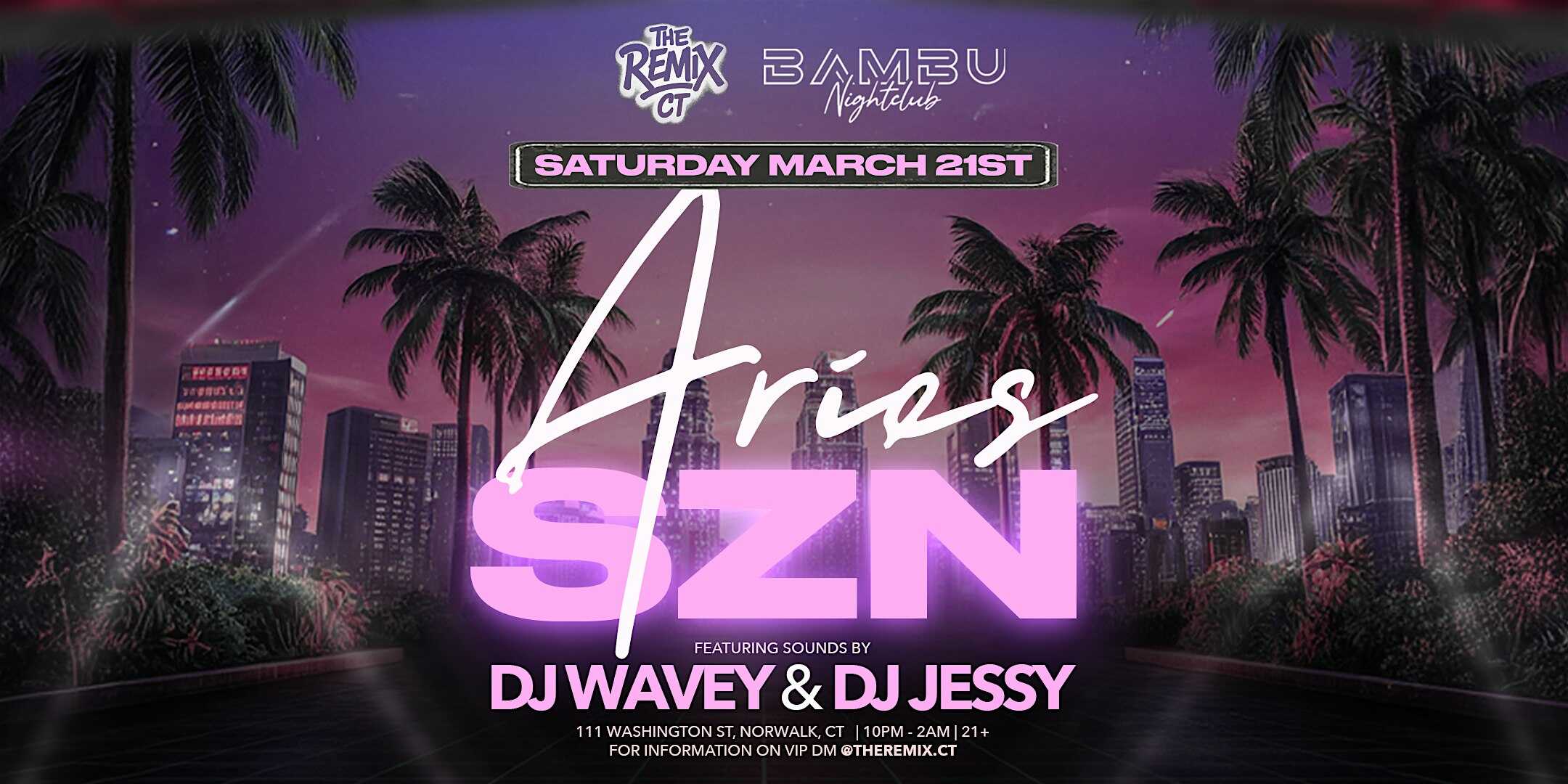 by admin23Feb The Remix Presents: Aries SZN at Bambu Night Club – Norwalk, CT The Remix Presents: Aries SZN at Bambu Night Club – Norwalk, CT 1 1 people viewed this event. On March 21st! Get ready to celebrate all things Aries with The Remix – a night full of vibes, it’s gonna be one you won’t want to miss! Tickets-RSVP Link Date And Time Saturday, March 21st, 2026 10:00 PM (PST) Venue Bambu Night Club Location 11 Washington Street, Norwalk, CT 6854 Event Types MusicParty or Social Gathering Event Category BridgeportConnecticut Share With Friends Facebook Twitter Linkedin Xing Pinterest Share This Post: