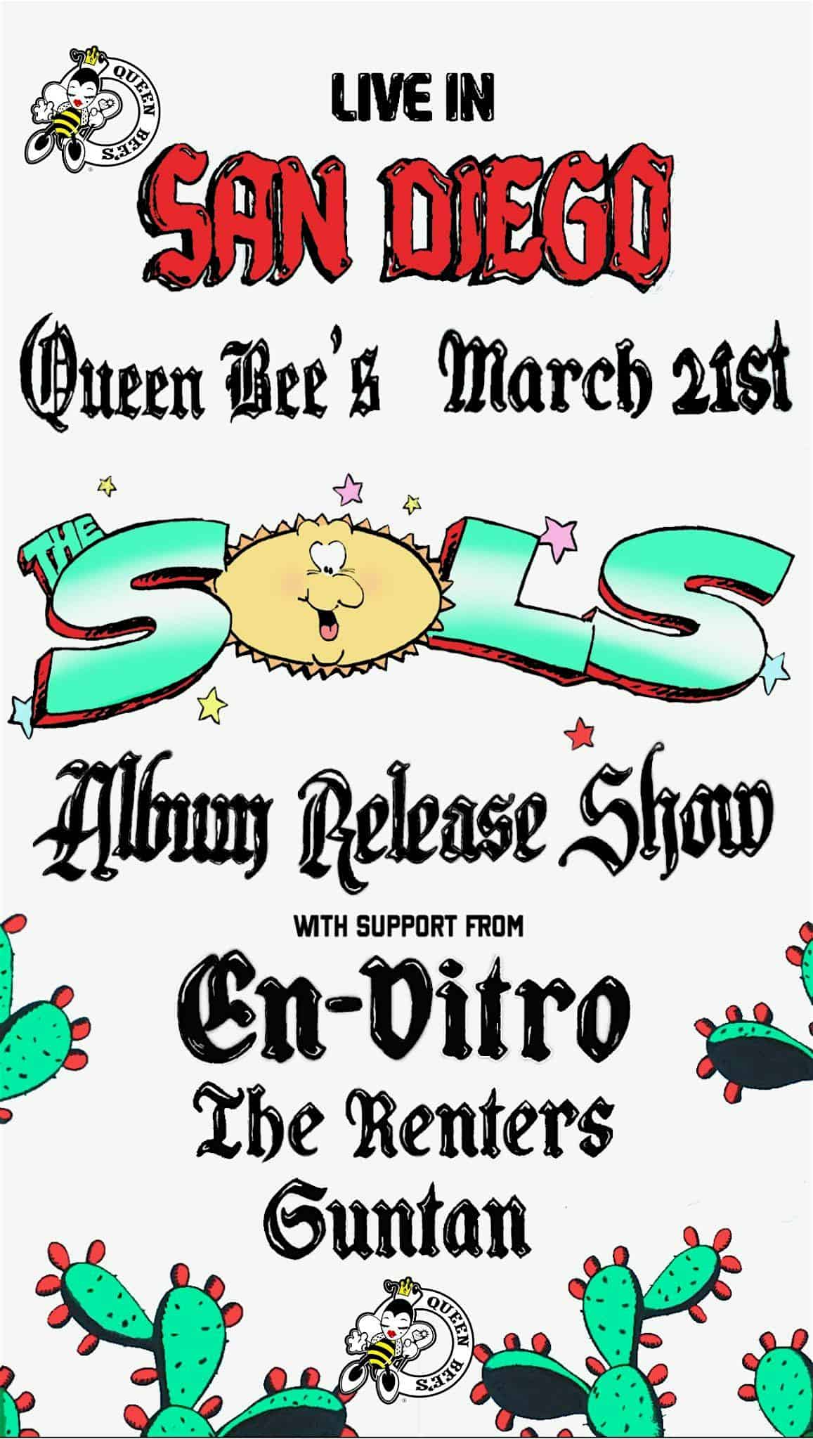 by admin23Feb THE SOLS ALBUM RELEASE SHOW at Queen Bee’s Art and Cultural Center – San Diego, CA THE SOLS ALBUM RELEASE SHOW at Queen Bee’s Art and Cultural Center – San Diego, CA 3 3 people viewed this event. THE SOLS ALBUM RELEASE SHOW -WITH EN -VITRO -THE RENTERS-SUNTAN Tickets-RSVP Link Date And Time Saturday, March 21st, 2026 05:00 PM (PST) Venue Queen Bee's Art and Cultural Center Location 3925 Ohio Street, San Diego, CA 92104 Event Types Concert or PerformanceMusic Event Category CaliforniaSan Diego Share With Friends Facebook Twitter Linkedin Xing Pinterest Share This Post: