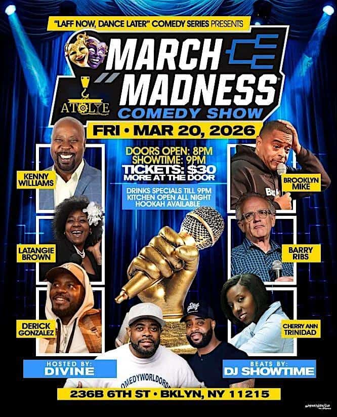 by admin14Feb TOKYO Presents… MARCH MADNESS COMEDY SHOW at Atolye Venue & Bar – Brooklyn, NY TOKYO Presents… MARCH MADNESS COMEDY SHOW at Atolye Venue & Bar – Brooklyn, NY 1 1 people viewed this event. Come for the laughs, stay for the turn up — Pull up, bring the crew, and get ready to laugh ‘til you cry and dance ‘til they cut the lights! Tickets-RSVP Link Date And Time Saturday, March 21st, 2026 12:00 AM (PST) Venue Atolye Venue & Bar Location 236b 6th Street, Brooklyn, NY 11215 Event Types Concert or PerformancePerforming & Visual Arts Event Category New York Share With Friends Facebook Twitter Linkedin Xing Pinterest Share This Post: