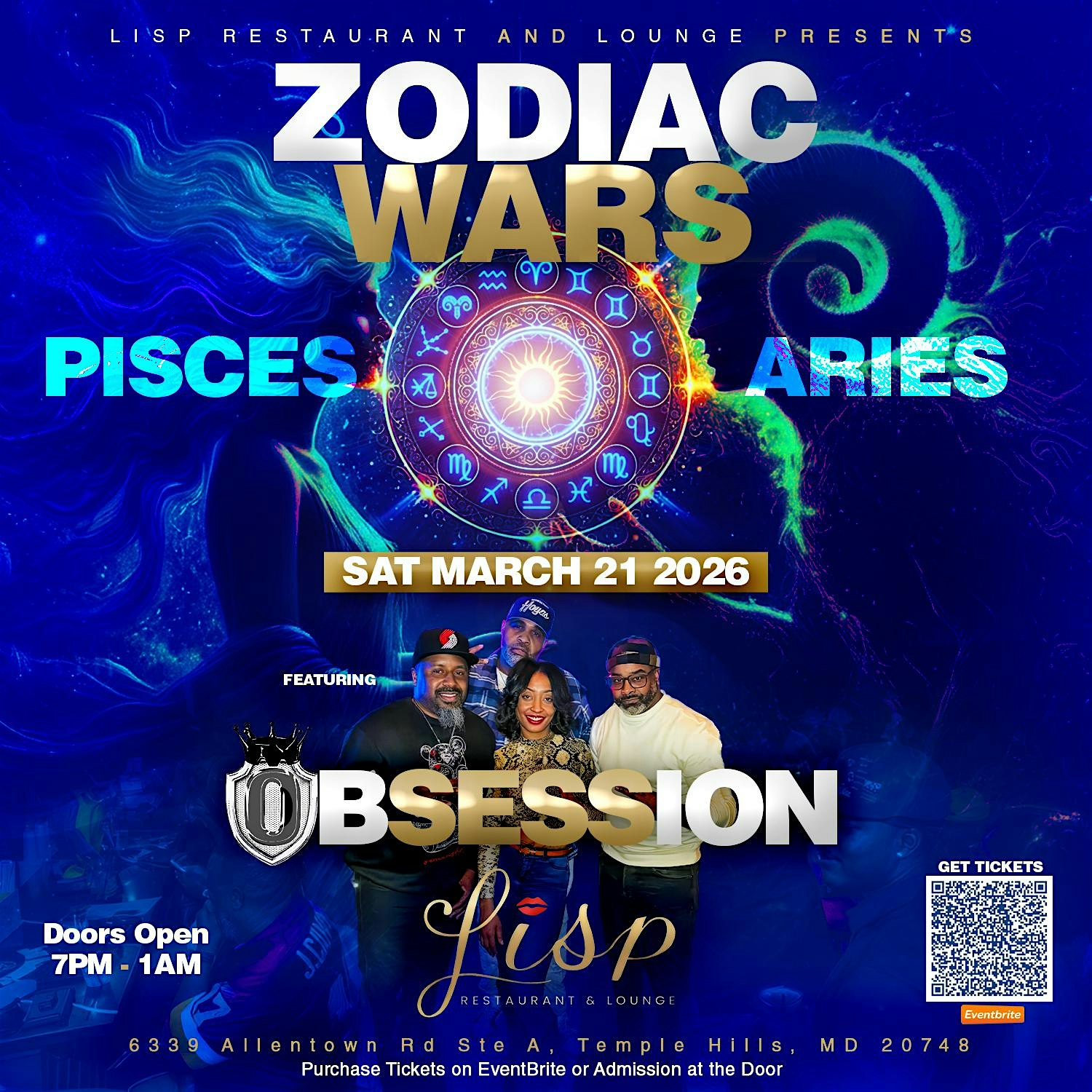 by admin13Feb ZODIAC WARS(Pisces ♓ vs Aries ♈) at Lisp Restaurant and Lounge – Temple Hills, MD ZODIAC WARS(Pisces ♓ vs Aries ♈) at Lisp Restaurant and Lounge – Temple Hills, MD 2 2 people viewed this event. Get ready to witness the clash of the zodiac signs with Pisces and Aries battling it out in an epic showdown! Tickets-RSVP Link Date And Time Saturday, March 21st, 2026 11:00 PM (PST) Venue Lisp Restaurant and Lounge Location 6339 Allentown Road, Temple Hills, MD 20748 Event Types Party or Social GatheringPerforming & Visual Arts Event Category MarylandNational Harbor Share With Friends Facebook Twitter Linkedin Xing Pinterest Share This Post: