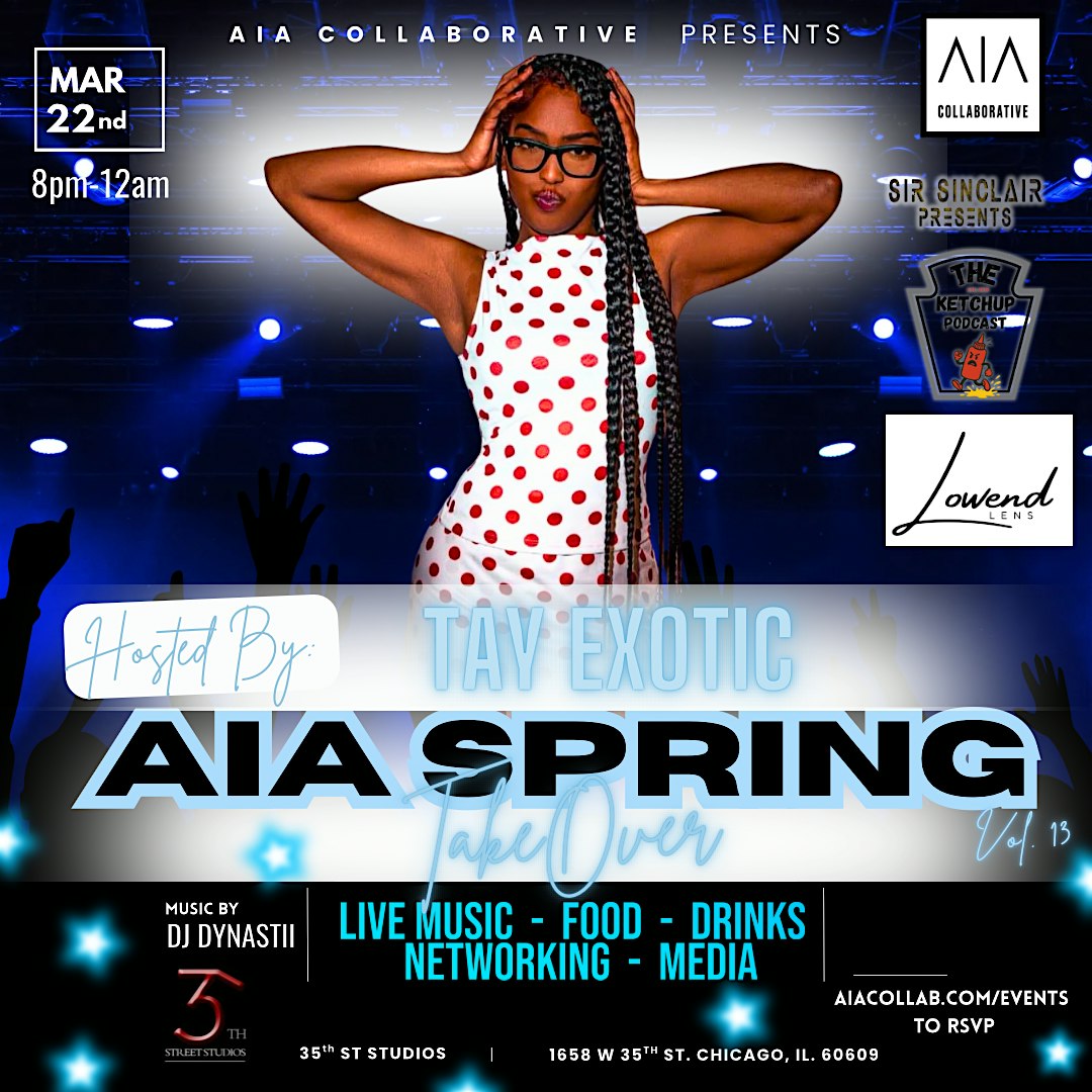 by admin27Feb AIA SPRING TAKEOVER LIVE IN CHICAGO at 35th Street Studios – Chicago, IL AIA SPRING TAKEOVER LIVE IN CHICAGO at 35th Street Studios – Chicago, IL 1 1 people viewed this event. Get ready, Chicago! AIA Spring Takeover Live is bringing the vibes and energy you don’t wanna miss! Tickets-RSVP Link Date And Time Sunday, March 22nd, 2026 08:00 PM (PST) Venue 35th Street Studios Location 1658 West 35th Street, Chicago, IL 60609 Event Types Concert or PerformanceMusic Event Category ChicagoIllinois Share With Friends Facebook Twitter Linkedin Xing Pinterest Share This Post: