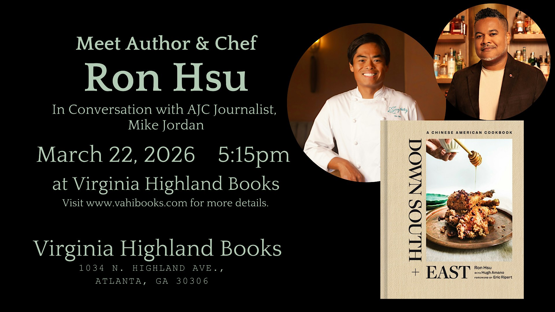 by admin24Feb An Evening with Atlanta Chef Ron Hsu! at Virginia Highland Books – Atlanta, GA An Evening with Atlanta Chef Ron Hsu! at Virginia Highland Books – Atlanta, GA 3 3 people viewed this event. Atlanta Chef Ron Hsu will be discussing his new cookbook “Down South + East”, Food, and Michelin Stars with AJC Journalist, Mike Jordan. Tickets-RSVP Link Date And Time Sunday, March 22nd, 2026 05:00 PM (PST) Venue Virginia Highland Books Location 1034 N Highland Avenue, Atlanta, GA 30306 Event Types Food & Drink Event Category AtlantaGeorgia Share With Friends Facebook Twitter Linkedin Xing Pinterest Share This Post: