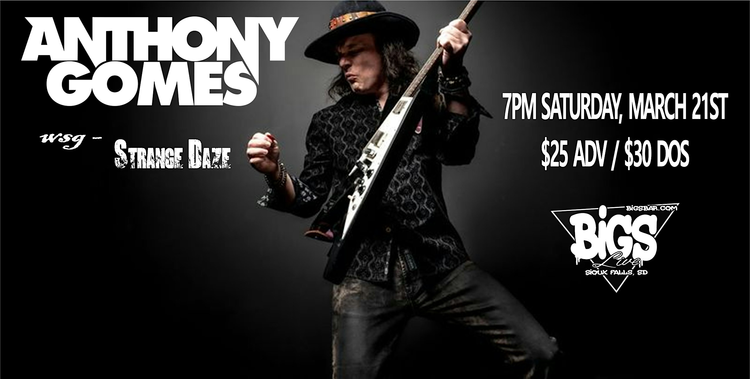 by admin13Feb ANTHONY GOMES at Bigs Bar Live at Bigs Bar – Sioux Falls, SD ANTHONY GOMES at Bigs Bar Live at Bigs Bar – Sioux Falls, SD 3 3 people viewed this event. Get ready to rock out with ANTHONY GOMES and special guest STRANGE DAZE! Tickets-RSVP Link Date And Time Sunday, March 22nd, 2026 12:00 AM (PST) Venue Bigs Bar Location 3110 West 12th Street, Sioux Falls, SD 57104 Event Types Concert or PerformanceMusic Event Category South Dakota Share With Friends Facebook Twitter Linkedin Xing Pinterest Share This Post: