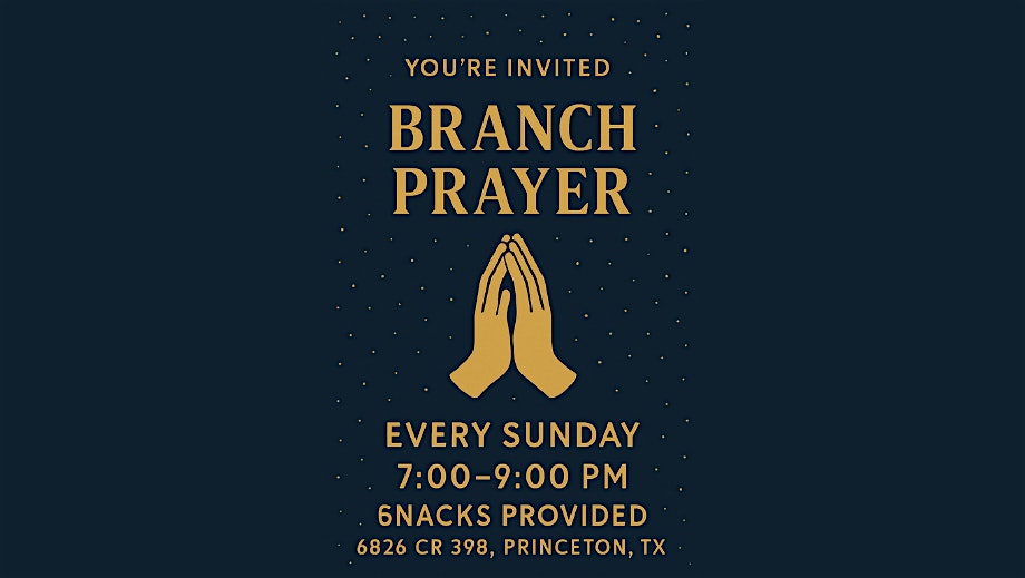 by admin24Feb Branch Prayer at Branch Prayer – Princeton, TX Branch Prayer at Branch Prayer – Princeton, TX 4 4 people viewed this event. You’re invited to come pray with us and have some snacks! Tickets-RSVP Link Date And Time Sunday, March 22nd, 2026 07:00 PM (PST) Venue Branch Prayer Location 6826 Country Road 398, Princeton, TX 75407 Event Types Music Event Category Texas Share With Friends Facebook Twitter Linkedin Xing Pinterest Share This Post: