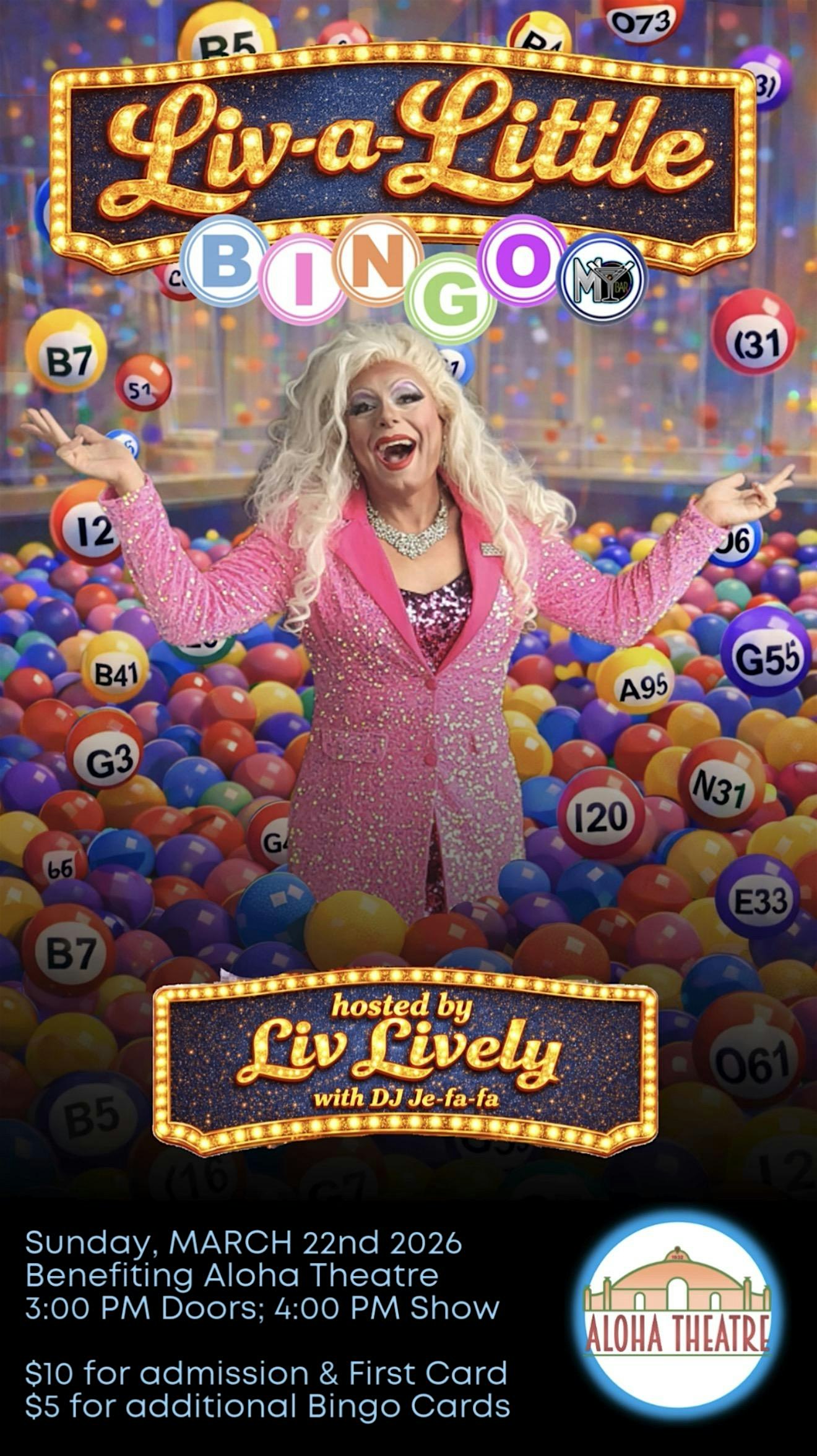 by admin27Feb DRAG BINGO- ALOHA THEATRE at MY BAR + Pizza and more!- LGBTQ Friendly Hot Spot – Kailua-Kona, HI DRAG BINGO- ALOHA THEATRE at MY BAR + Pizza and more!- LGBTQ Friendly Hot Spot – Kailua-Kona, HI 1 1 people viewed this event. SUNDAY FUNDAY DRAG BINGO YOU CAN’T MISS w/ LIV LIVELY! Come grab a table with friends and support a different local non-profit each month! Tickets-RSVP Link Date And Time Sunday, March 22nd, 2026 @ 03:00 PM Location 74-5606 Luhia Street, Kailua-Kona, HI 96740 Event Types Community & CultureParty or Social Gathering Event Category Hawaii Share With Friends Facebook Twitter Linkedin Xing Pinterest Share This Post: