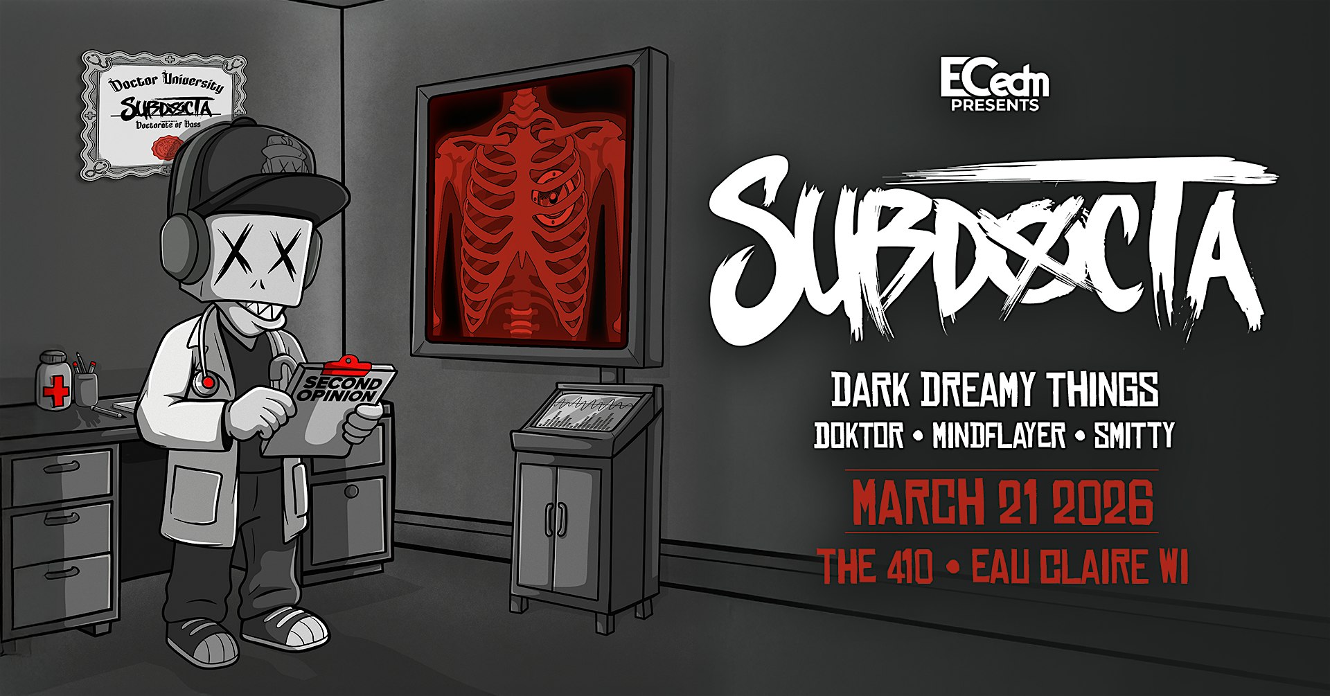 by admin13Feb ECedm Presents: SUBDOCTA – Second Opinion Tour at The 410 Bar – Eau Claire, WI ECedm Presents: SUBDOCTA – Second Opinion Tour at The 410 Bar – Eau Claire, WI 2 2 people viewed this event. We couldn’t be more excited to be bringing SUBDOCTA to The 410 in Eau Claire, WI! Tickets-RSVP Link Date And Time Sunday, March 22nd, 2026 02:00 AM (PST) Venue The 410 Bar Location 420 Galloway Street, Eau Claire, WI 54703 Event Types Concert or PerformanceMusic Event Category Wisconsin Share With Friends Facebook Twitter Linkedin Xing Pinterest Share This Post: