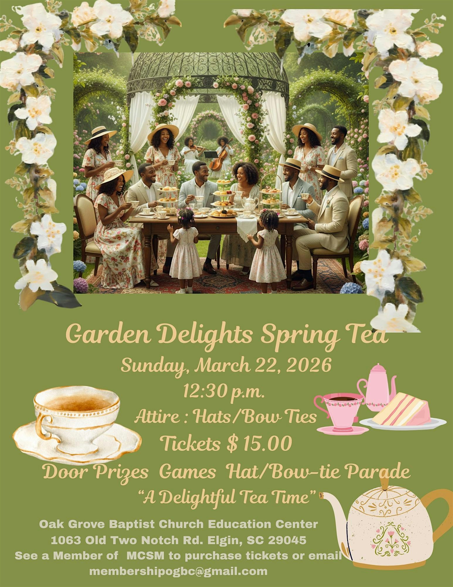 Garden Delights Spring Tea at 1063 Old Two Notch Rd – Elgin, SC Garden Delights Spring Tea at 1063 Old Two Notch Rd – Elgin, SC 1 1 people viewed this event. Join us for Garden Delights Spring Tea – a cozy gathering with fresh brews and blooms in person! Tickets-RSVP Link Register for event Date And Time Sunday, March 22nd, 2026 @ 12:00 PM Location 1063 Old Two Notch Road, Elgin, SC 29045 Event Types Dinner or GalaFood & Drink Event Category South Carolina Share With Friends Facebook Twitter Linkedin Xing Pinterest