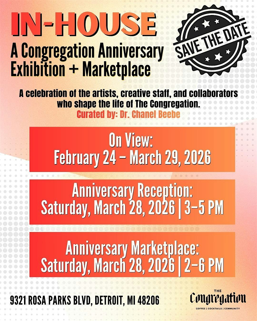 IN-HOUSE: A Congregation Anniversary Exhibition + Marketplace at The Congregation – Detroit, MI IN-HOUSE: A Congregation Anniversary Exhibition + Marketplace at The Congregation – Detroit, MI 3 3 people viewed this event. Celebrating The Congregation’s creative community! An anniversary exhibition + marketplace featuring the artists who bring our space to life Tickets-RSVP Link Register for event Date And Time Sunday, March 22nd, 2026 @ 09:00 AM Location 9321 Rosa Parks Boulevard, Detroit, MI 48206 Event Types Festival or FairPerforming & Visual Arts Event Category DetroitMichigan Share With Friends Facebook Twitter Linkedin Xing Pinterest