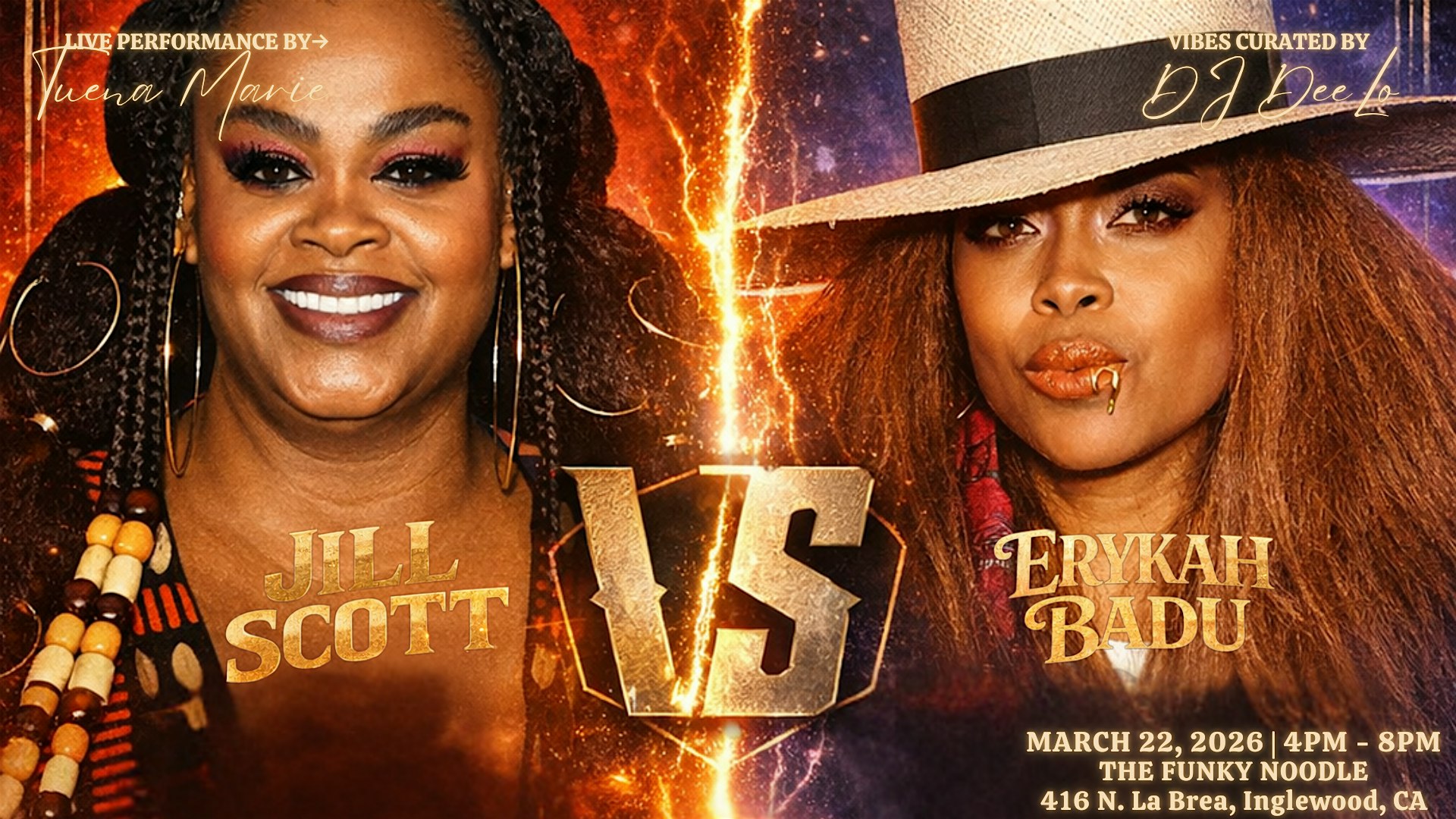 by admin24Feb Jill Scott vs Erykah Badu: A Neo-Soul Experience at The Funky Noodle at 416 N La Brea Ave – Inglewood, CA Jill Scott vs Erykah Badu: A Neo-Soul Experience at The Funky Noodle at 416 N La Brea Ave – Inglewood, CA 2 2 people viewed this event. Neo-soul celebration of Jill Scott and Erykah Badu with DJ Dee Lo and live performance by Tuena Marie at The Funky Noodle. Tickets-RSVP Link Date And Time Sunday, March 22nd, 2026 04:00 PM (PST) Venue 416 N La Brea Ave Location 416 North La Brea Avenue, Inglewood, CA 90302 Event Types Concert or PerformanceMusic Event Category California Share With Friends Facebook Twitter Linkedin Xing Pinterest Share This Post:
