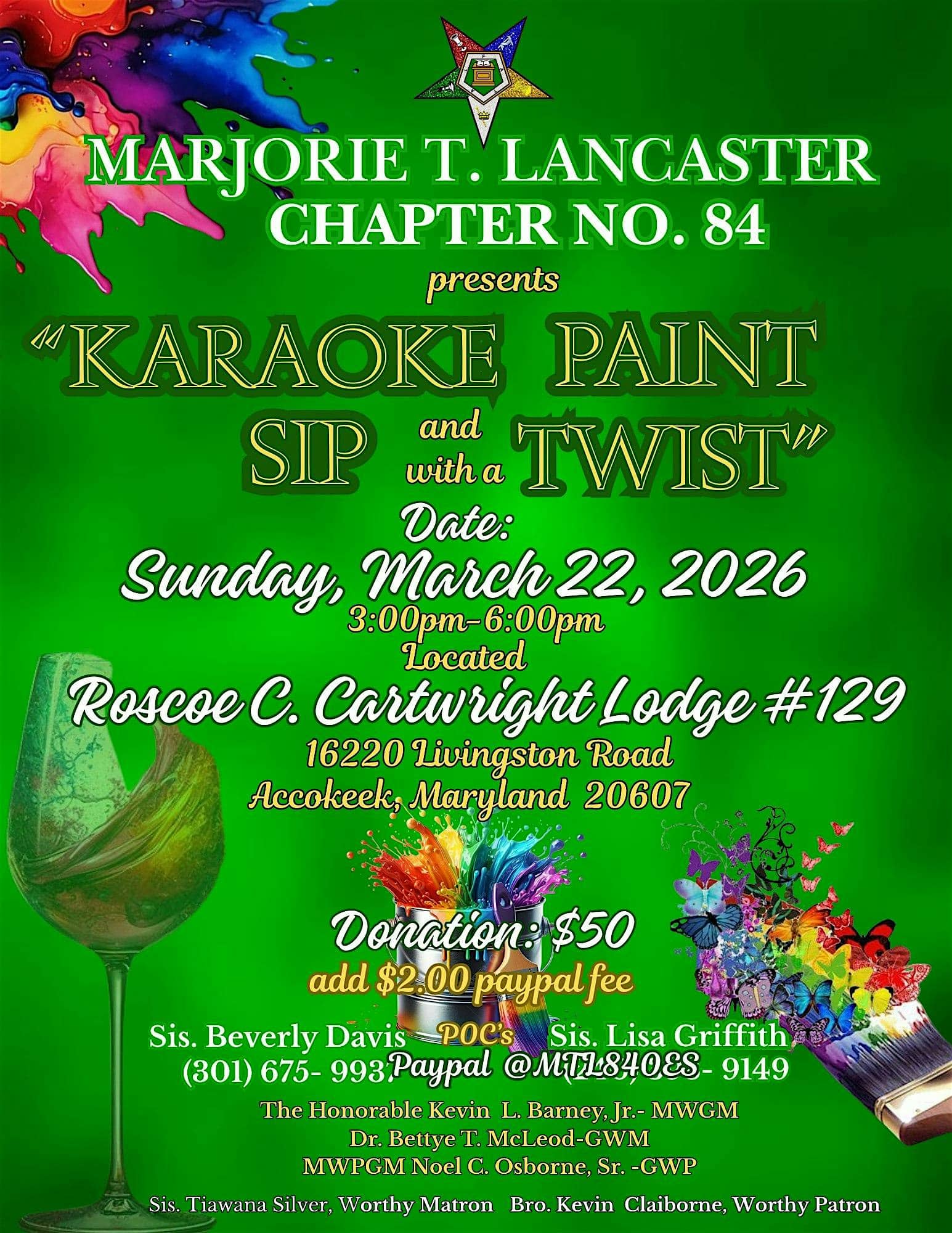 by admin14Feb KARAOKE SIP and with a PAINT TWIST at Roscoe C Cartwright 129 – Accokeek, MD KARAOKE SIP and with a PAINT TWIST at Roscoe C Cartwright 129 – Accokeek, MD 1 1 people viewed this event. Come out and enjoy a night with the Sisters and Brothers of Marjorie T Lancaster Chapter No 84 Tickets-RSVP Link Date And Time Sunday, March 22nd, 2026 07:00 PM (PST) Venue Roscoe C Cartwright 129 Location 16220 Livingston Road, Accokeek, MD 20607 Share With Friends Facebook Twitter Linkedin Xing Pinterest Share This Post: