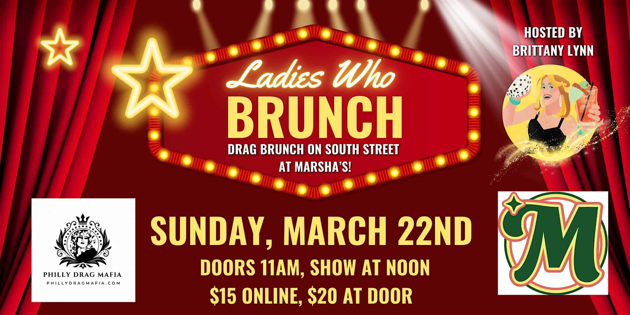 by admin23Feb Ladies Who Brunch at Marsha’s on South Street at Marsha’s – Philadelphia, PA Ladies Who Brunch at Marsha’s on South Street at Marsha’s – Philadelphia, PA 2 2 people viewed this event. Join us at Marsha’s South Street for Drag Brunch starring Brittany Lynn and her dolls- brunch, cocktails, and jaw dropping performances! Tickets-RSVP Link Date And Time Sunday, March 22nd, 2026 11:00 AM (PST) Venue Marsha’s Location 430 South Street, Philadelphia, PA 19147 Event Types Party or Social GatheringPerforming & Visual Arts Event Category PennsylvaniaPhiladelphia Share With Friends Facebook Twitter Linkedin Xing Pinterest Share This Post: