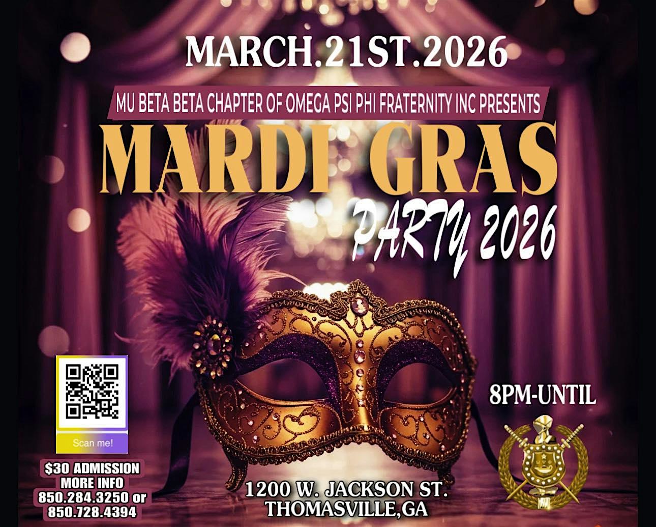 by admin13Feb Mu Beta Beta Presents: Omega Mardi Gras 2026 at Receptions For You – Thomasville, GA Mu Beta Beta Presents: Omega Mardi Gras 2026 at Receptions For You – Thomasville, GA 3 3 people viewed this event. Mu Beta Beta Chapter of Omega Psi Phi, Fraternity, Inc., presents Mardi Gras Party 2026. Join us for music, vibes, and Mardi Gras flair. Tickets-RSVP Link Date And Time Sunday, March 22nd, 2026 12:00 AM (PST) Venue Receptions For You Location 1200 West Jackson Street, Thomasville, GA 31792 Event Types Community & CultureParty or Social Gathering Event Category Georgia Share With Friends Facebook Twitter Linkedin Xing Pinterest Share This Post: