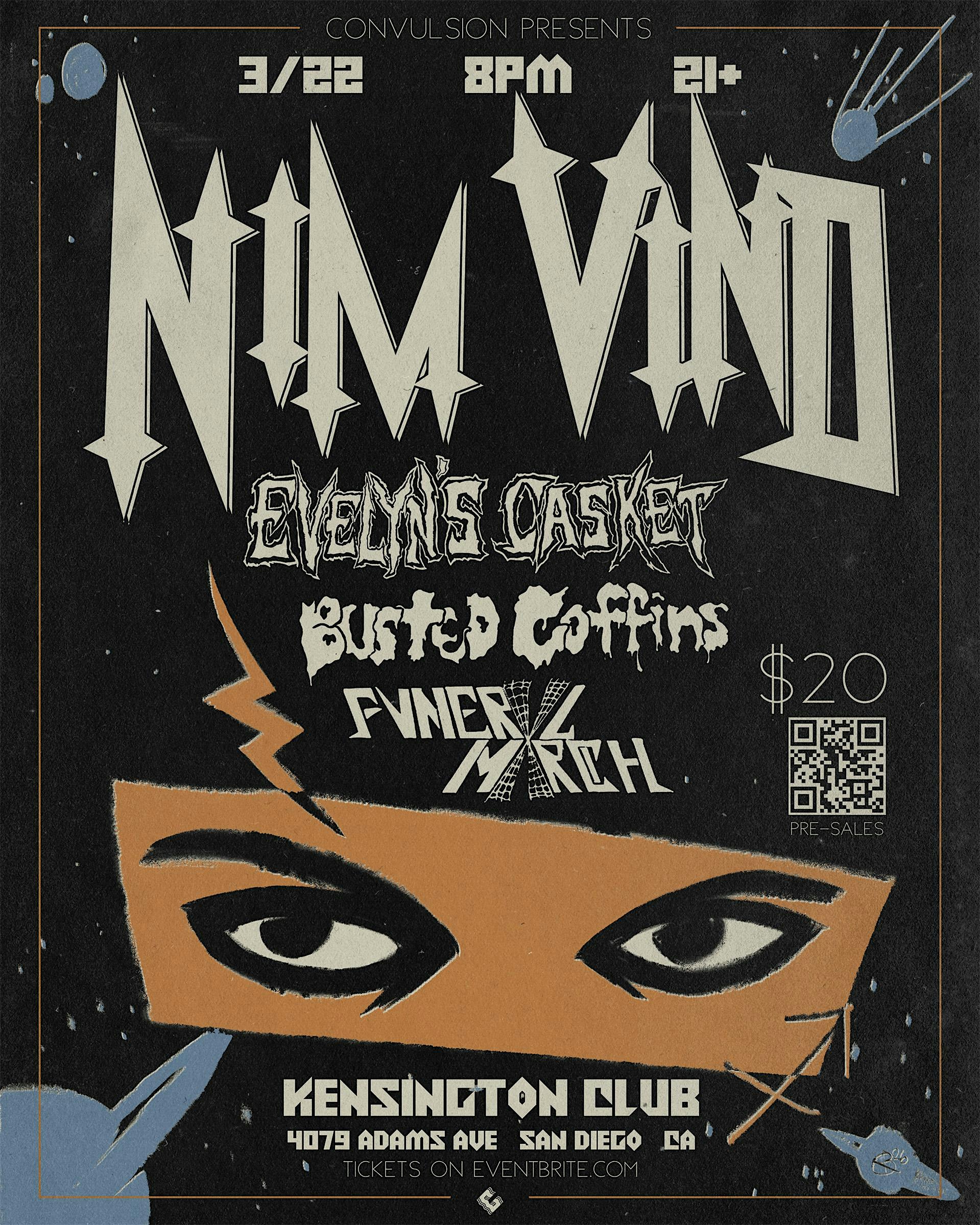 by admin24Feb NIM VIND and EVELYN’S CASKET with guests at Kensington Club – San Diego, CA NIM VIND and EVELYN’S CASKET with guests at Kensington Club – San Diego, CA 2 2 people viewed this event. Horrorpunks NIM VIND (Canada) and EVELYN’S CASKET (Seattle) with local San Diego support from Busted Coffins and Fvnerxl Mxrch! Tickets-RSVP Link Date And Time Sunday, March 22nd, 2026 08:00 PM (PST) Venue Kensington Club Location 4079 Adams Avenue, San Diego, CA 92116 Event Types Concert or PerformanceMusic Event Category CaliforniaSan Diego Share With Friends Facebook Twitter Linkedin Xing Pinterest Share This Post: