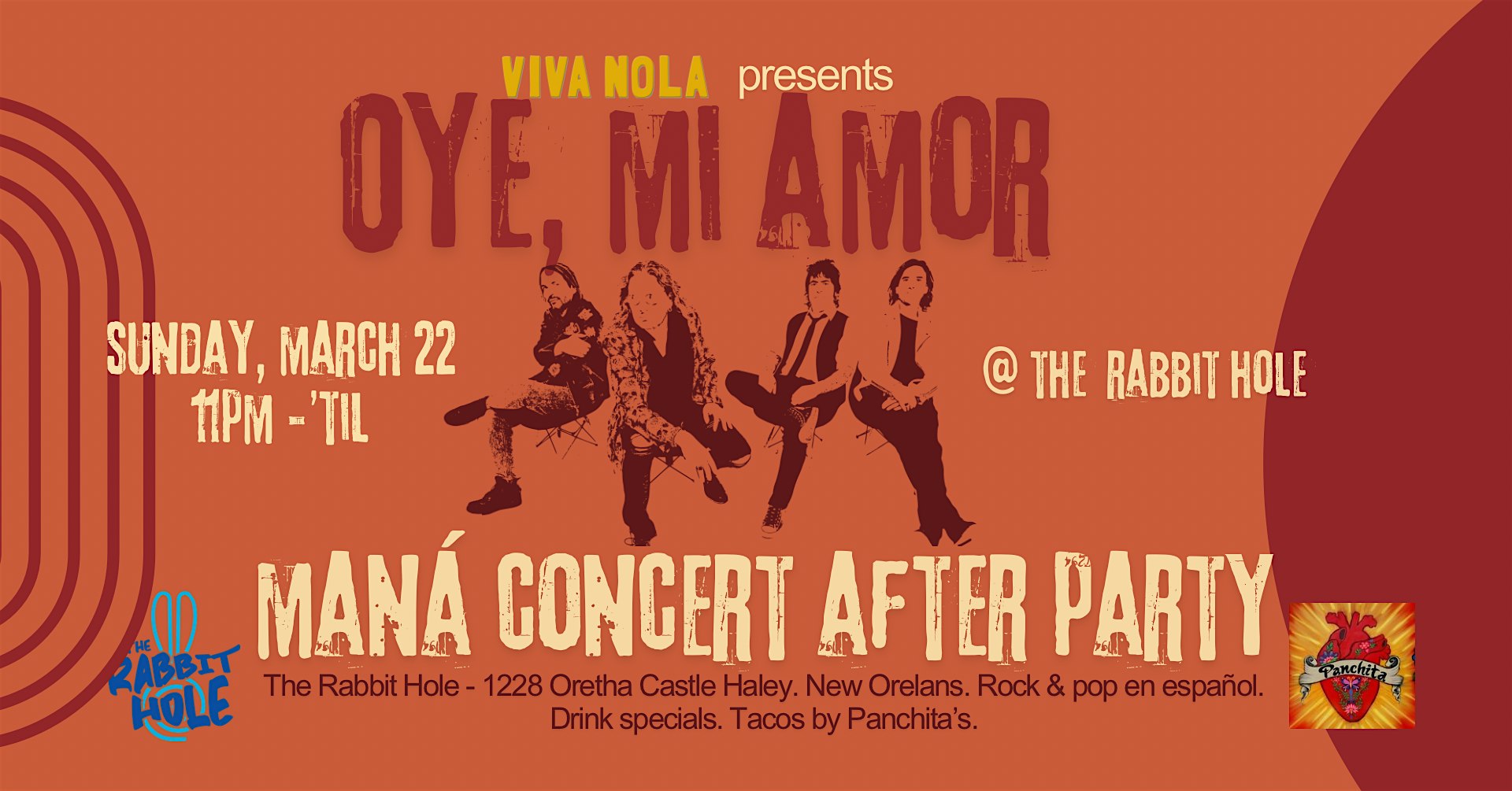 by admin27Feb OYE MI AMOR – Presented by VIVA NOLA at The Rabbit Hole – New Orleans, LA OYE MI AMOR – Presented by VIVA NOLA at The Rabbit Hole – New Orleans, LA 1 1 people viewed this event. MANÁ CONCERT AFTER PARTY Tickets-RSVP Link Date And Time Sunday, March 22nd, 2026 11:00 PM (PST) Venue The Rabbit Hole Location 1228 Oretha Castle Haley Boulevard, New Orleans, LA 70113 Event Types Concert or PerformanceMusic Event Category LouisianaNew Orleans Share With Friends Facebook Twitter Linkedin Xing Pinterest Share This Post: