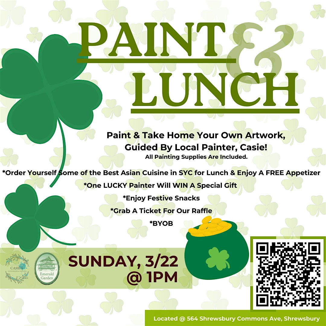 Paint & Lunch at Emerald Garden – Shrewsbury, PA Paint & Lunch at Emerald Garden – Shrewsbury, PA 1 1 people viewed this event. Casie’s Canvases & Emerald Garden bring you our St. Patty’s Day Themed Paint & Lunch on March 22nd!~ Tickets-RSVP Link Register for event Date And Time Sunday, March 22nd, 2026 @ 01:00 PM Location 564 Shrewsbury Commons Ave, Shrewsbury, PA 17361 Event Types Class, Training, or WorkshopFood & Drink Event Category Pennsylvania Share With Friends Facebook Twitter Linkedin Xing Pinterest