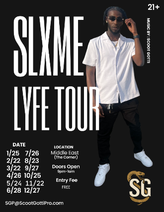 21+ w/Valid I.D. NO I.D.=NO ADMISSIONThe Middle East presents: – Scoot Gotti SLXME LYFE Tour – 21+ 9:00pm doors NO VAPING OR SMOKING IN THE BUILDING*** DINE and SKIP the Line ***