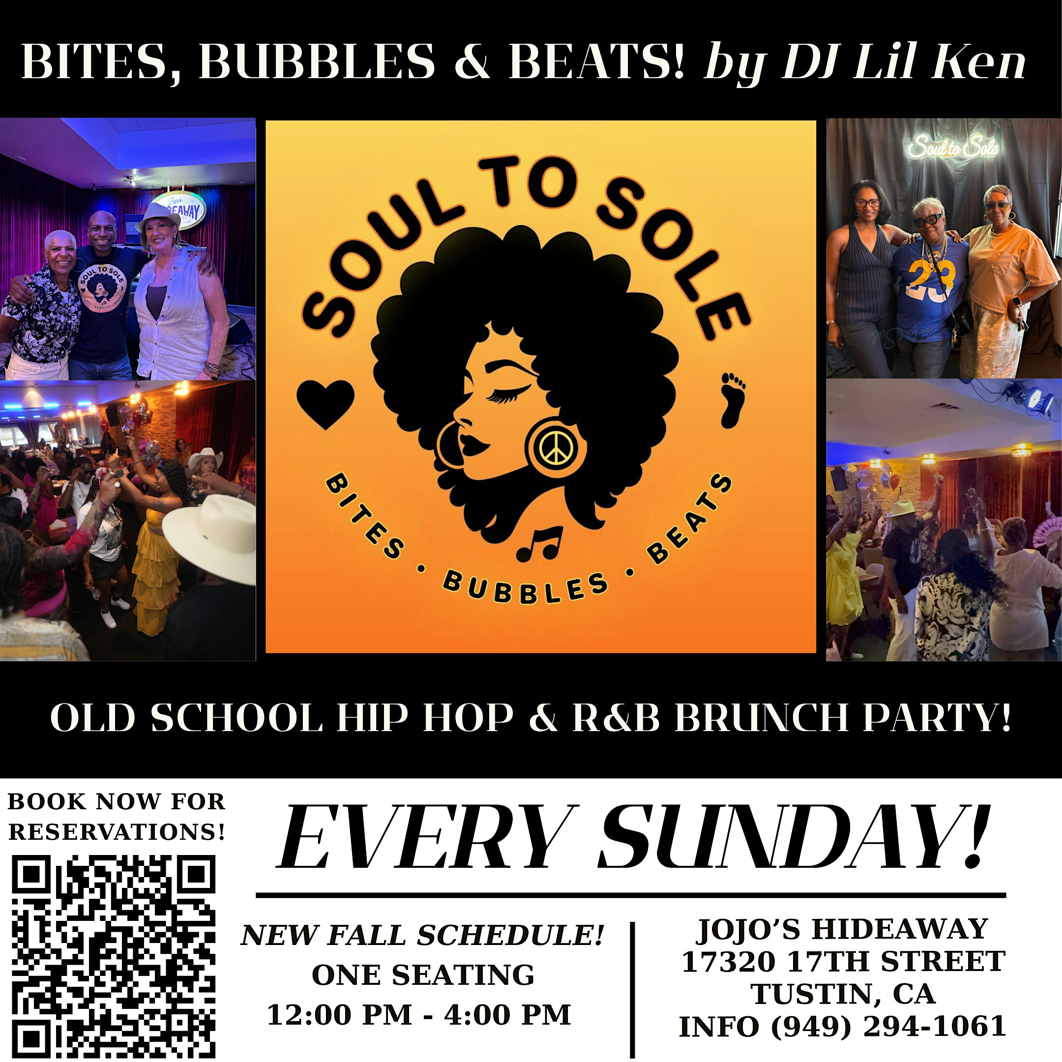 by admin24Feb Soul To Sole at 17320 17th St – Tustin, CA Soul To Sole at 17320 17th St – Tustin, CA 2 2 people viewed this event. Soul To Sole Brunch has moved to JoJo’s Hideaway. Fresh vibes, same beats, better brunch. Sundays in Tustin—come vibe from Soul to Sole! Tickets-RSVP Link Date And Time Sunday, March 22nd, 2026 12:00 PM (PST) Venue 17320 17th St Location 17320 17th Street, Tustin, CA 92780 Event Types Concert or PerformanceMusic Event Category CaliforniaIrvine Share With Friends Facebook Twitter Linkedin Xing Pinterest Share This Post: