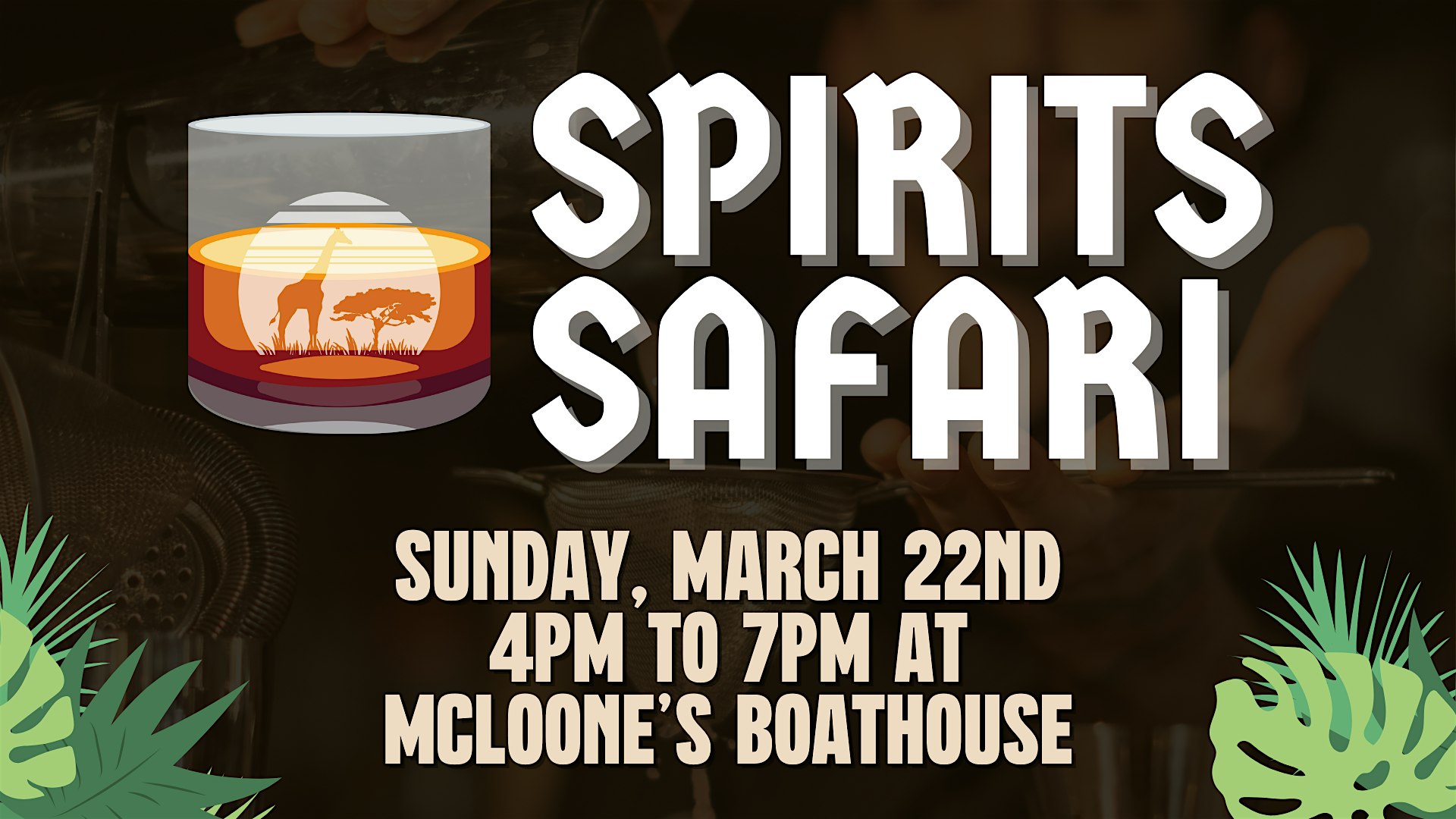Spirits Safari 2026 at McLoone’s Boathouse – West Orange, NJ Spirits Safari 2026 at McLoone’s Boathouse – West Orange, NJ 1 1 people viewed this event. Welcome spring exploring a variety of craft spirits from NJ’s finest distilleries at McLoone’s all to support wildlife conservation. Tickets-RSVP Link Register for event Date And Time Sunday, March 22nd, 2026 @ 04:00 PM Location 9 Cherry Lane, West Orange, NJ 7052 Event Types Food & DrinkTour Event Category New Jersey Share With Friends Facebook Twitter Linkedin Xing Pinterest