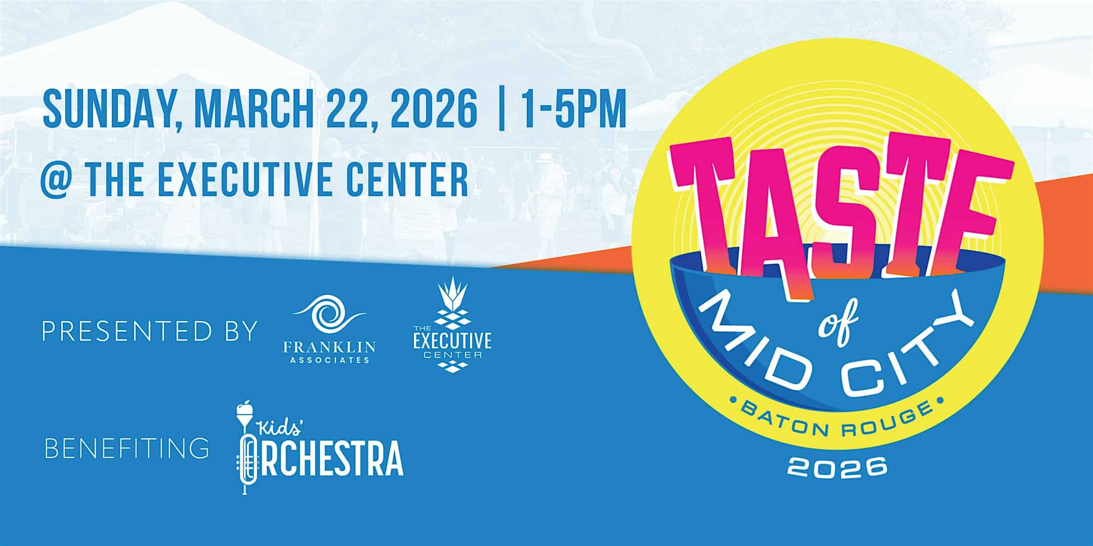 by admin14Feb Taste of Mid City at The Executive Center BR – Baton Rouge, LA Taste of Mid City at The Executive Center BR – Baton Rouge, LA 3 3 people viewed this event. Mark your calendar! Join us for a lively celebration of Mid City’s finest flavors—featuring mouthwatering food, and vibrant music! Tickets-RSVP Link Date And Time Sunday, March 22nd, 2026 06:00 PM (PST) Venue The Executive Center BR Location 250 South Foster Drive, Baton Rouge, LA 70806 Event Types Festival or FairFood & Drink Event Category Baton RougeLouisiana Share With Friends Facebook Twitter Linkedin Xing Pinterest Share This Post:
