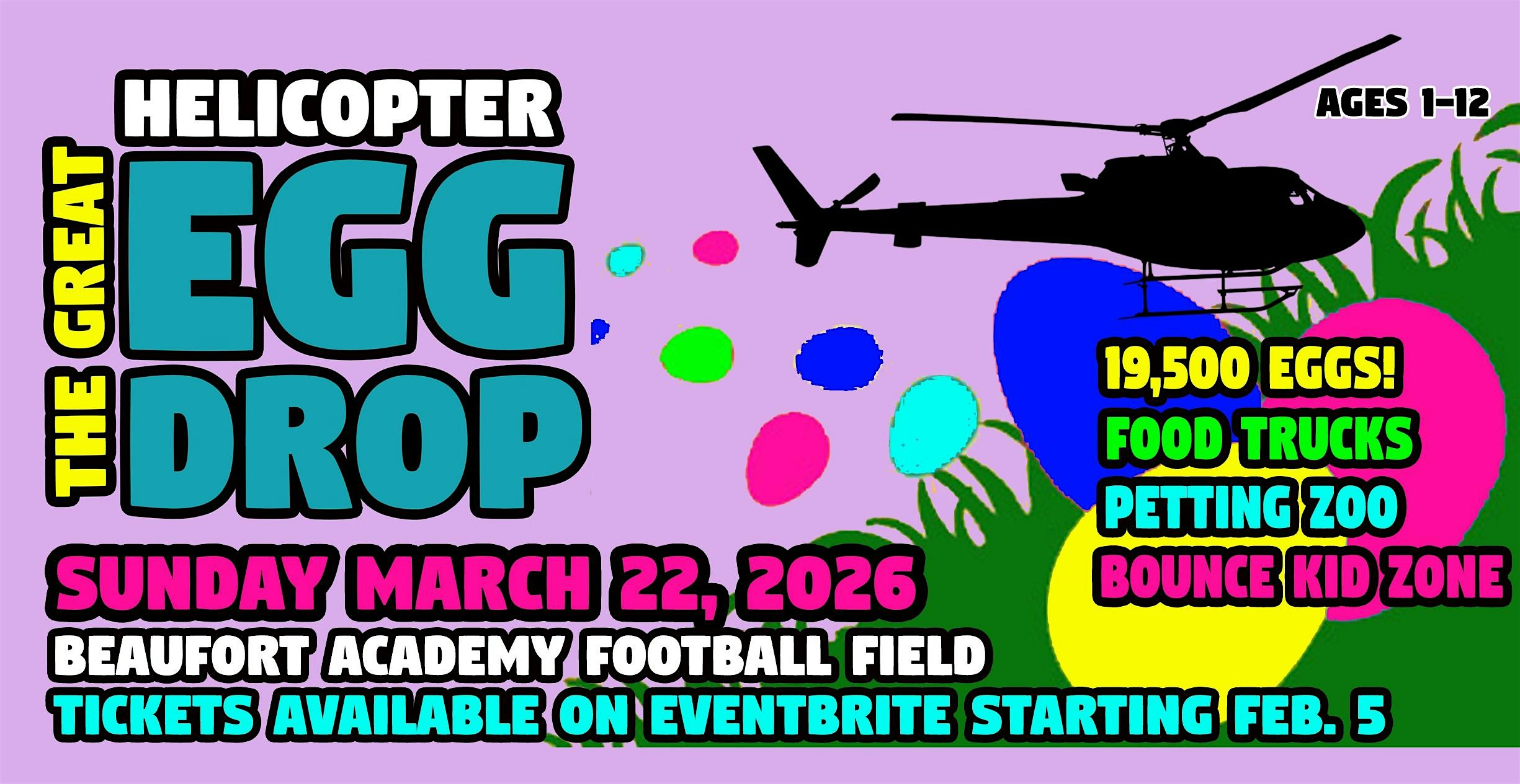 The 2026 Great Helicopter Easter Egg Drop at Beaufort Academy Football Field – Beaufort, SC The 2026 Great Helicopter Easter Egg Drop at Beaufort Academy Football Field – Beaufort, SC 2 2 people viewed this event. Community Easter event where 19,500 plastic eggs will be dropped from a Helicopter on the Beaufort Academy Football Field on March 22, 2026. Tickets-RSVP Link Register for event Date And Time Sunday, March 22nd, 2026 @ 11:00 AM Location 240 Sams Point Road, Beaufort, SC 29907 Event Types Festival or FairSeasonal & Holiday Event Category South Carolina Share With Friends Facebook Twitter Linkedin Xing Pinterest