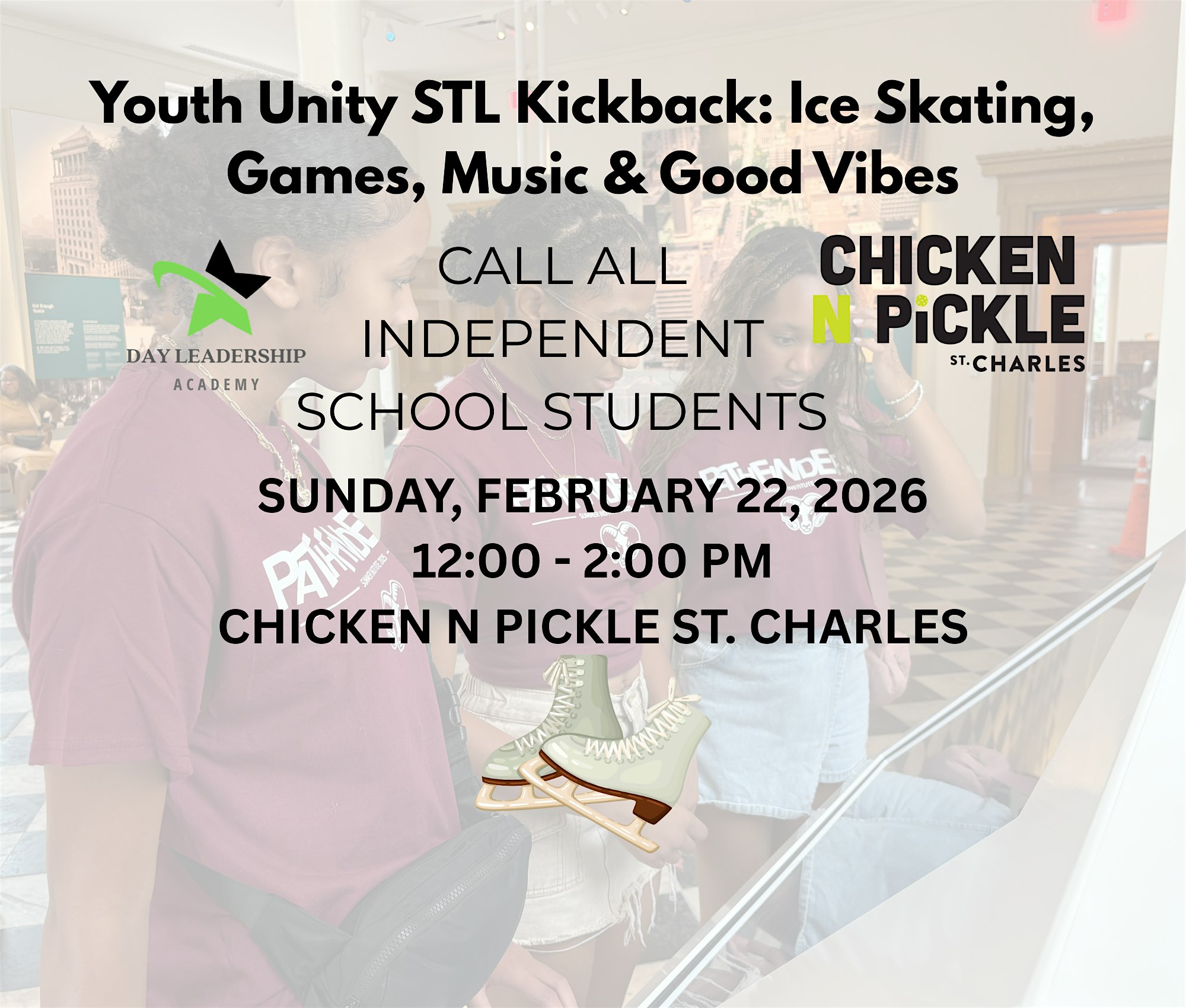 by admin13Feb Youth Unity STL Kickback: Ice Skating, Games, Music & Good Vibes at Chicken N Pickle – St. Charles – Saint Charles, MO Youth Unity STL Kickback: Ice Skating, Games, Music & Good Vibes at Chicken N Pickle – St. Charles – Saint Charles, MO 2 2 people viewed this event. Youth Unity STL Kickback – Hosted by Blacks in Independent Schools – open to all students from all backgrounds for UNITY! Tickets-RSVP Link Date And Time Sunday, March 22nd, 2026 05:00 AM (PST) Venue Chicken N Pickle - St. Charles Location 1500 South Main Street, Saint Charles, MO 63303 Event Types Community & CultureParty or Social Gathering Event Category Missouri Share With Friends Facebook Twitter Linkedin Xing Pinterest Share This Post: