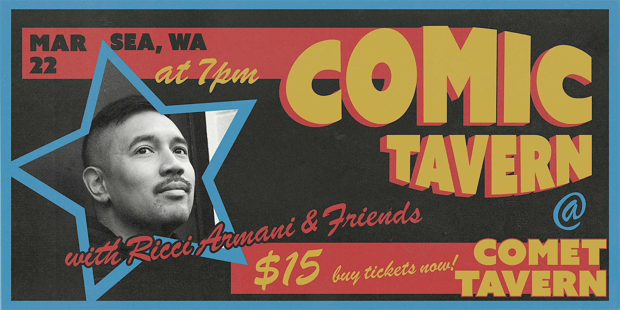 by admin14Feb Comic Tavern: a Comedy Night w/ Ricci Armani & Friends at Comet Tavern – Seattle, WA Comic Tavern: a Comedy Night w/ Ricci Armani & Friends at Comet Tavern – Seattle, WA 2 2 people viewed this event. Join us at Comet Tavern for a pop up comedy night with talented Seattle based Comedian, Ricci Armani, and friends! Tickets-RSVP Link Date And Time Monday, March 23rd, 2026 02:00 AM (PST) Venue Comet Tavern Location 922 East Pike Street, Seattle, WA 98122 Event Types Concert or PerformancePerforming & Visual Arts Event Category SeattleWashington Share With Friends Facebook Twitter Linkedin Xing Pinterest Share This Post: