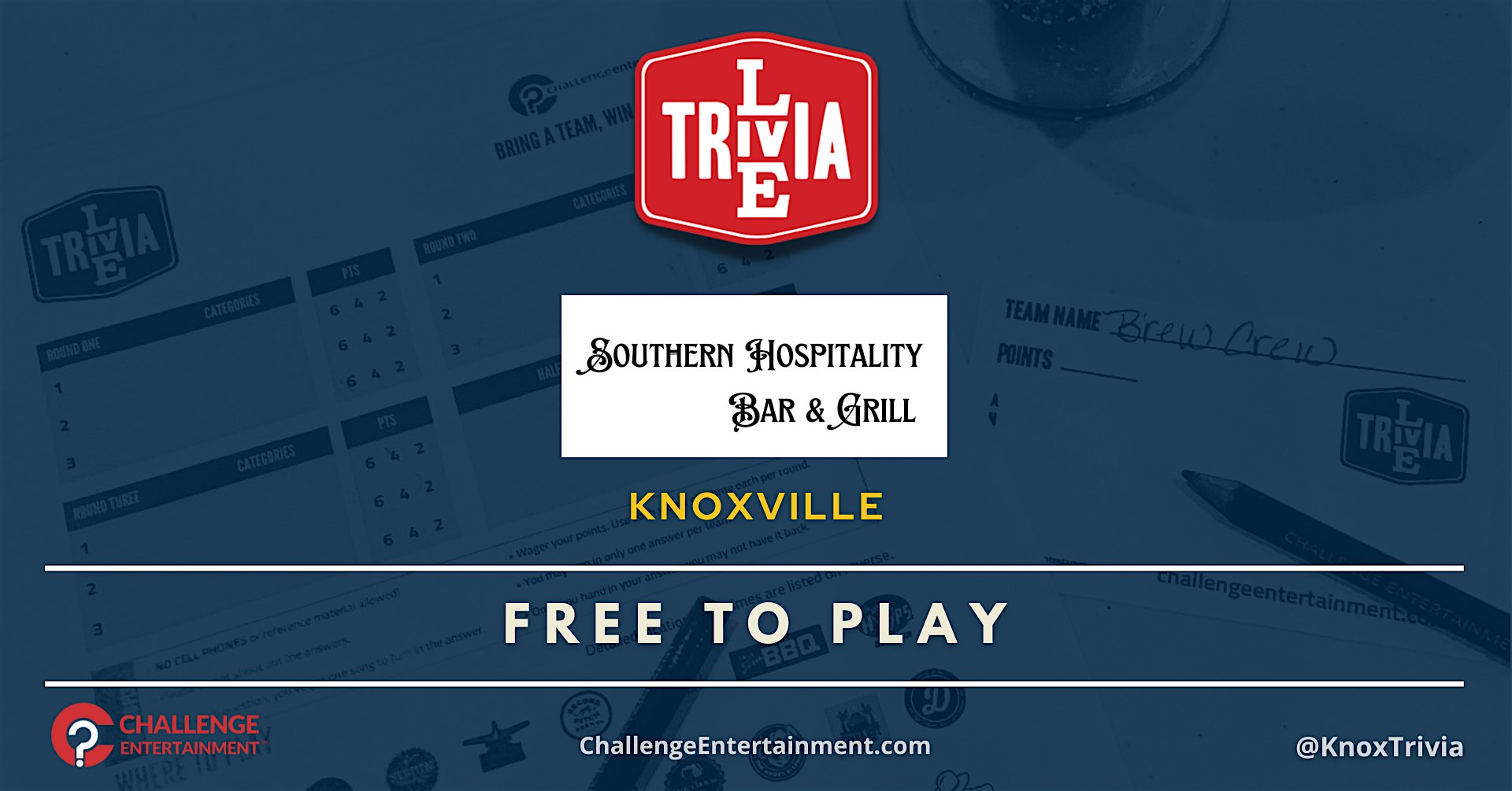 Live Trivia Nights at Southern Hospitality Bar & Grill – Knoxville at Southern Hospitality Bar and Grill – Knoxville, TN Live Trivia Nights at Southern Hospitality Bar & Grill – Knoxville at Southern Hospitality Bar and Grill – Knoxville, TN 1 1 people viewed this event. Live Trivia Nights at Southern Hospitality Bar & Grill – Knoxville Tickets-RSVP Link Register for event Date And Time Monday, March 23rd, 2026 @ 07:00 PM Location 5634 Merchants Center Boulevard, Knoxville, TNĀ 37912 Event Types Food & DrinkGame or Competition Event Category Tennessee Share With Friends Facebook Twitter Linkedin Xing Pinterest