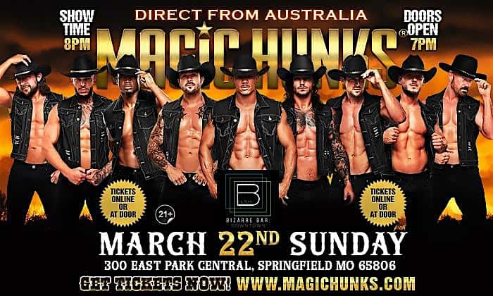 by admin14Feb MAGIC HUNKS AUSTRALIA TAKEOVER SPRINGFIELD, MO USA!!! at Bizarre: Gallery & Grill – Springfield, MO MAGIC HUNKS AUSTRALIA TAKEOVER SPRINGFIELD, MO USA!!! at Bizarre: Gallery & Grill – Springfield, MO 1 1 people viewed this event. Experience the THUNDER of Australia’s Ultimate Girls Night Out! TICKETS On Sale NOW! 21+ Doors 7pm Don’t miss the Best Girls Night Ever! Tickets-RSVP Link Date And Time Monday, March 23rd, 2026 01:00 AM (PST) Venue Bizarre: Gallery & Grill Location 300 Park Central East, Springfield, MO 65806 Event Types Concert or PerformancePerforming & Visual Arts Event Category Missouri Share With Friends Facebook Twitter Linkedin Xing Pinterest Share This Post: