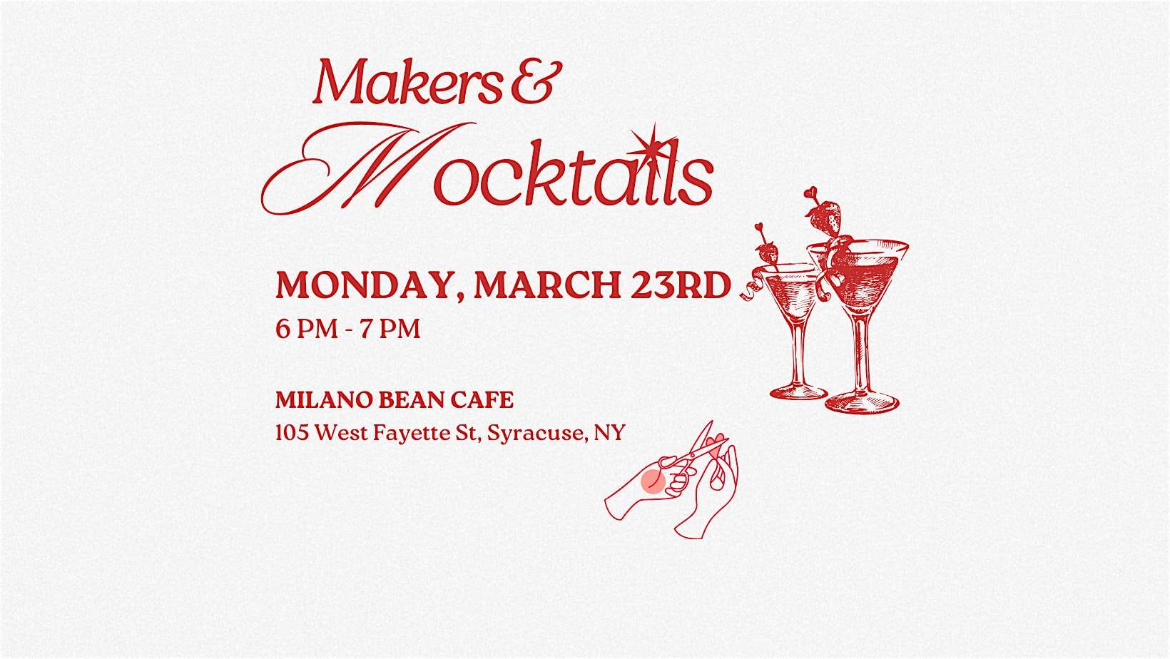 by admin23Feb Makers and Mocktails at Milano Bean Cafe SYR – Syracuse, NY Makers and Mocktails at Milano Bean Cafe SYR – Syracuse, NY 2 2 people viewed this event. Join us for Makers & Mocktails at Milano Bean Café, a low-key social hour with a mocktail and a surprise self-paced craft. Tickets-RSVP Link Date And Time Monday, March 23rd, 2026 06:00 PM (PST) Venue Milano Bean Cafe SYR Location 105 West Fayette Street, Syracuse, NY 13202 Event Types Food & DrinkParty or Social Gathering Event Category New York Share With Friends Facebook Twitter Linkedin Xing Pinterest Share This Post: