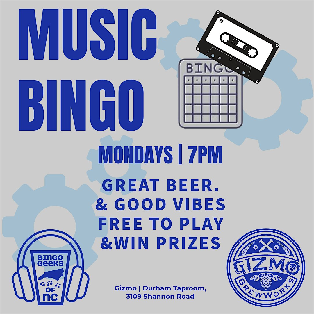 MUSIC BINGO AT GIZMO DURHAM at Gizmo Brew Works – Durham Taproom – Durham, NC MUSIC BINGO AT GIZMO DURHAM at Gizmo Brew Works – Durham Taproom – Durham, NC 1 1 people viewed this event. Come join us for a fun night of music bingo at Gizmo Durham! Tickets-RSVP Link Register for event Date And Time Monday, March 23rd, 2026 @ 07:00 PM Location 3109 Shannon Road, Durham, NCĀ 27707 Event Types Food & DrinkGame or Competition Event Category DurhamNorth Carolina Share With Friends Facebook Twitter Linkedin Xing Pinterest