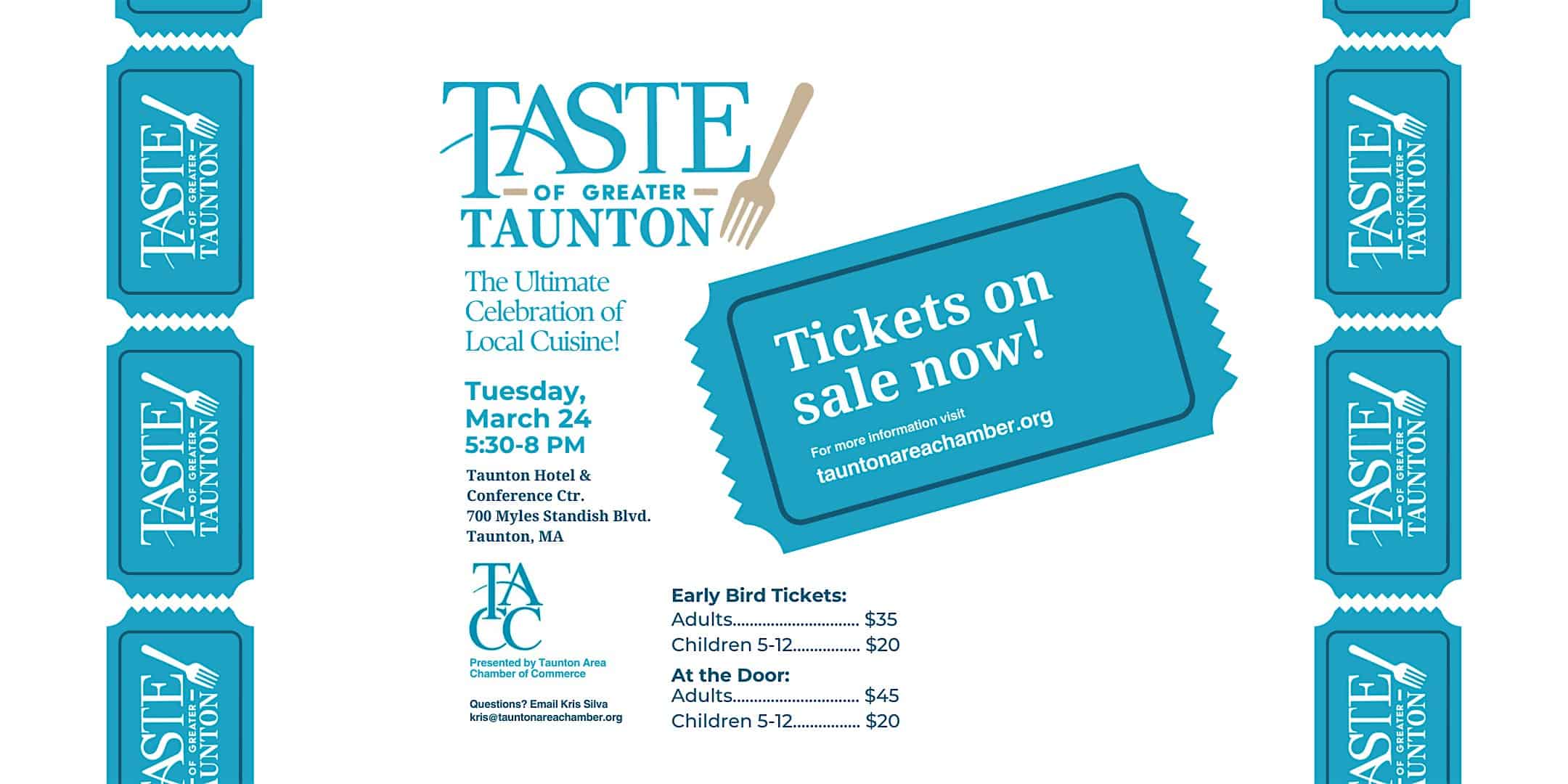 by admin14Feb 2026 Taste of Greater Taunton at 700 Myles Standish Blvd – Taunton, MA 2026 Taste of Greater Taunton at 700 Myles Standish Blvd – Taunton, MA 2 2 people viewed this event. Come taste the best food and drinks that Greater Taunton has to offer at this event presented by the Taunton Area Chamber of Commerce! Tickets-RSVP Link Date And Time Tuesday, March 24th, 2026 09:00 PM (PST) Venue 700 Myles Standish Blvd Location 700 Myles Standish Boulevard, Taunton, MA 2780 Event Types Festival or FairFood & Drink Event Category Massachusetts Share With Friends Facebook Twitter Linkedin Xing Pinterest Share This Post: